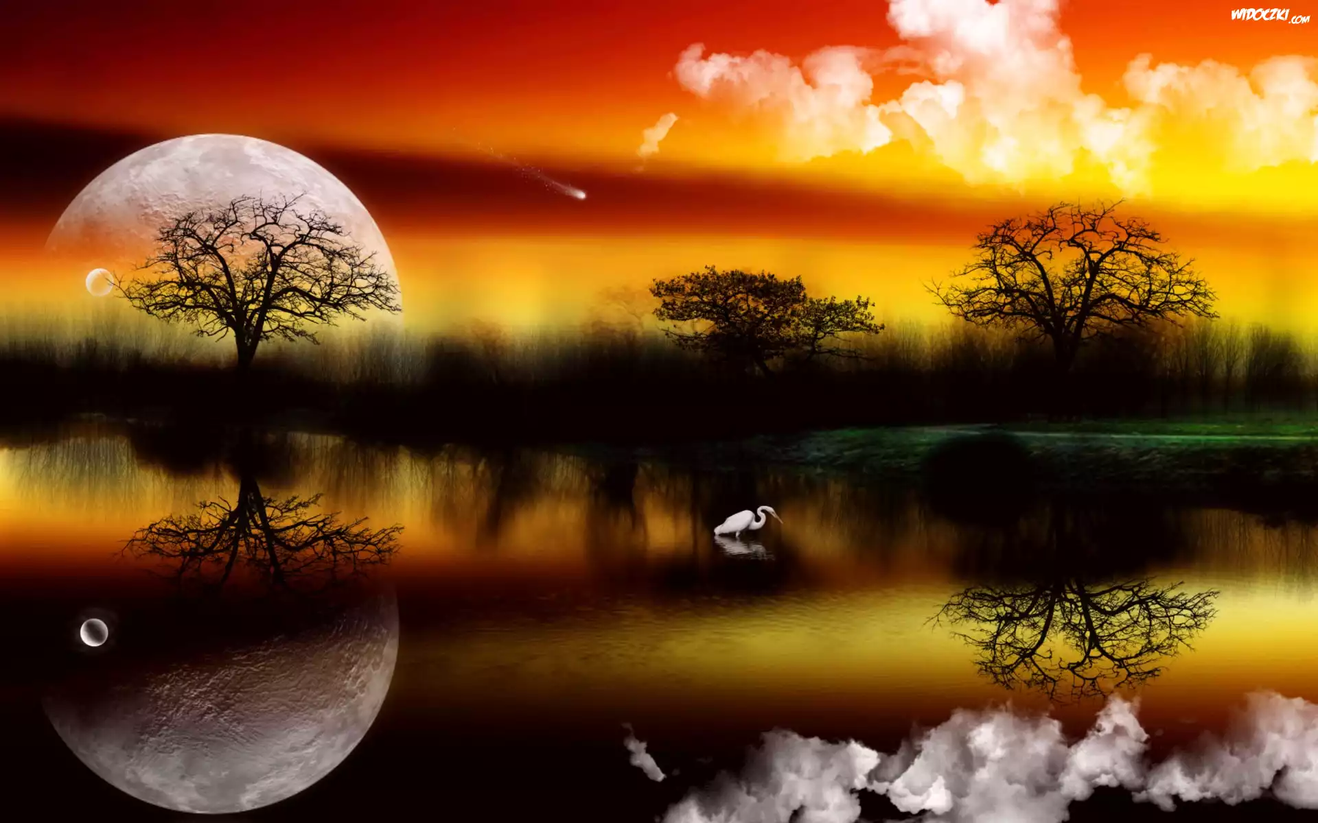 Zdjęcia, Zachód, Słońca, Planeta, Jezioro, Czapla