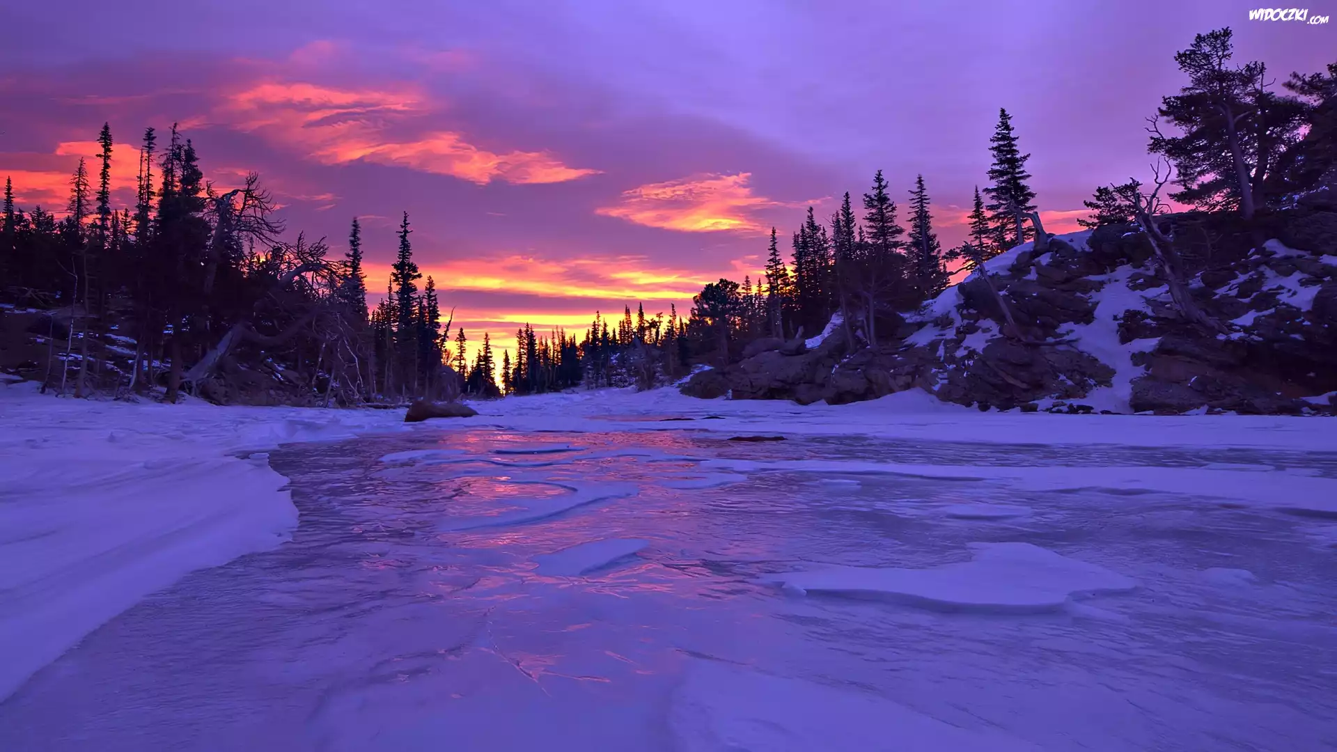 Zdjęcia, Zachód, Słońca, Jezioro, Choinki