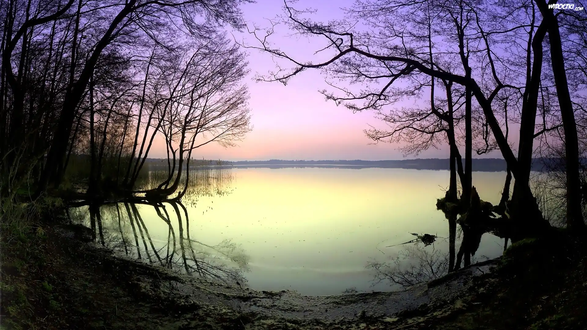 Zdjęcia, Zachód, Słońca, Jezioro, Drzewa