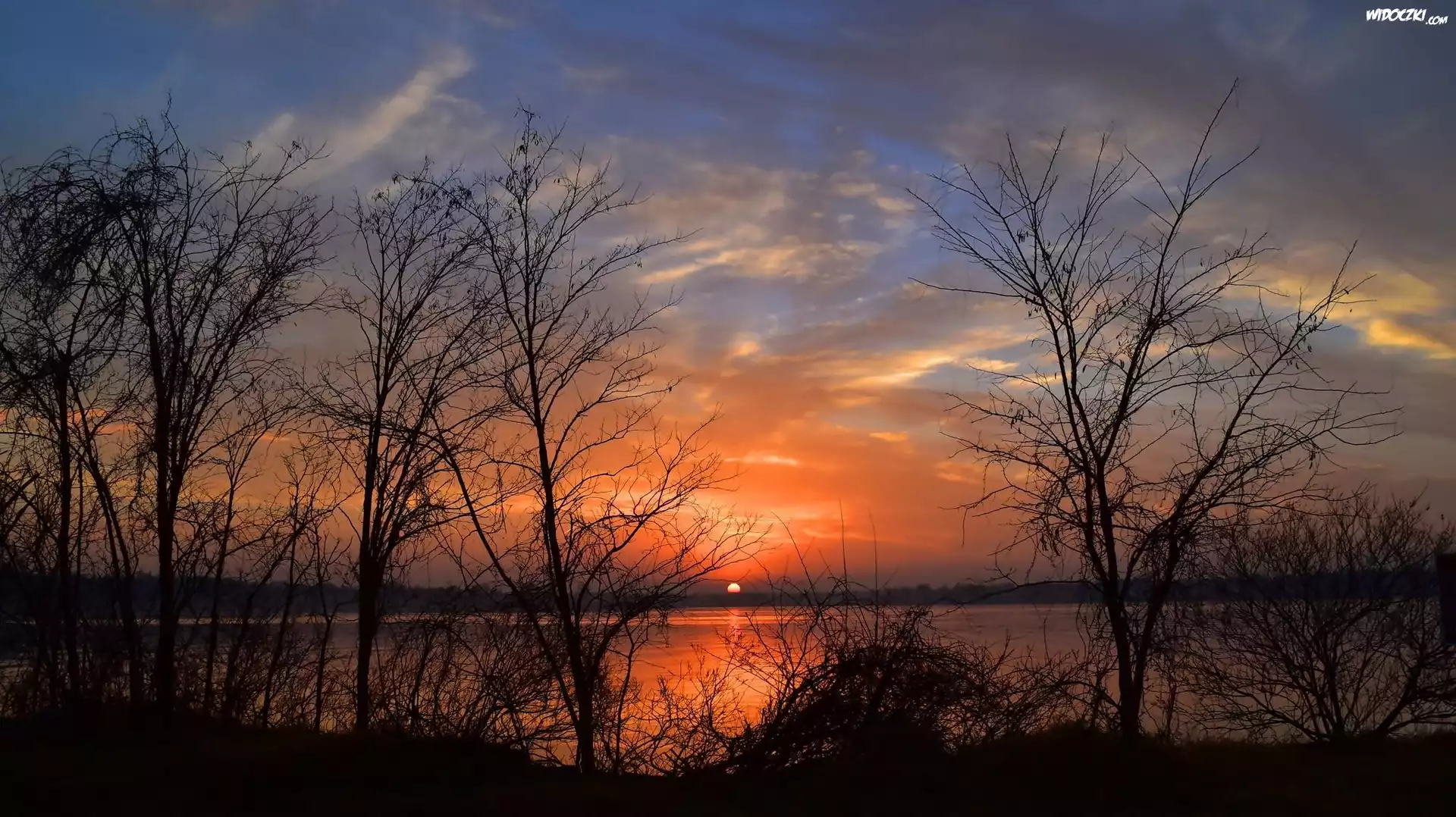 Zdjęcia, Zachód słońca, Jezioro, Drzewa