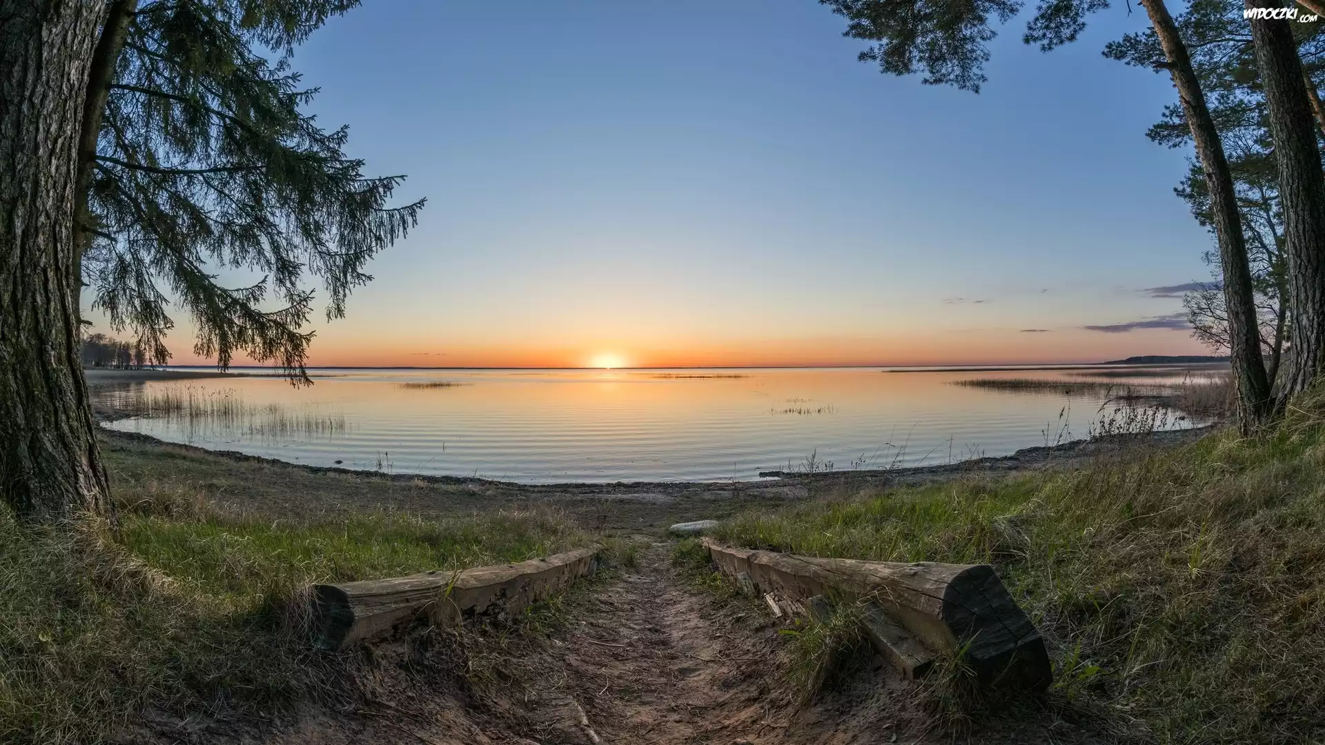 Zdjęcia, Zachód słońca, Jezioro, Drzewa