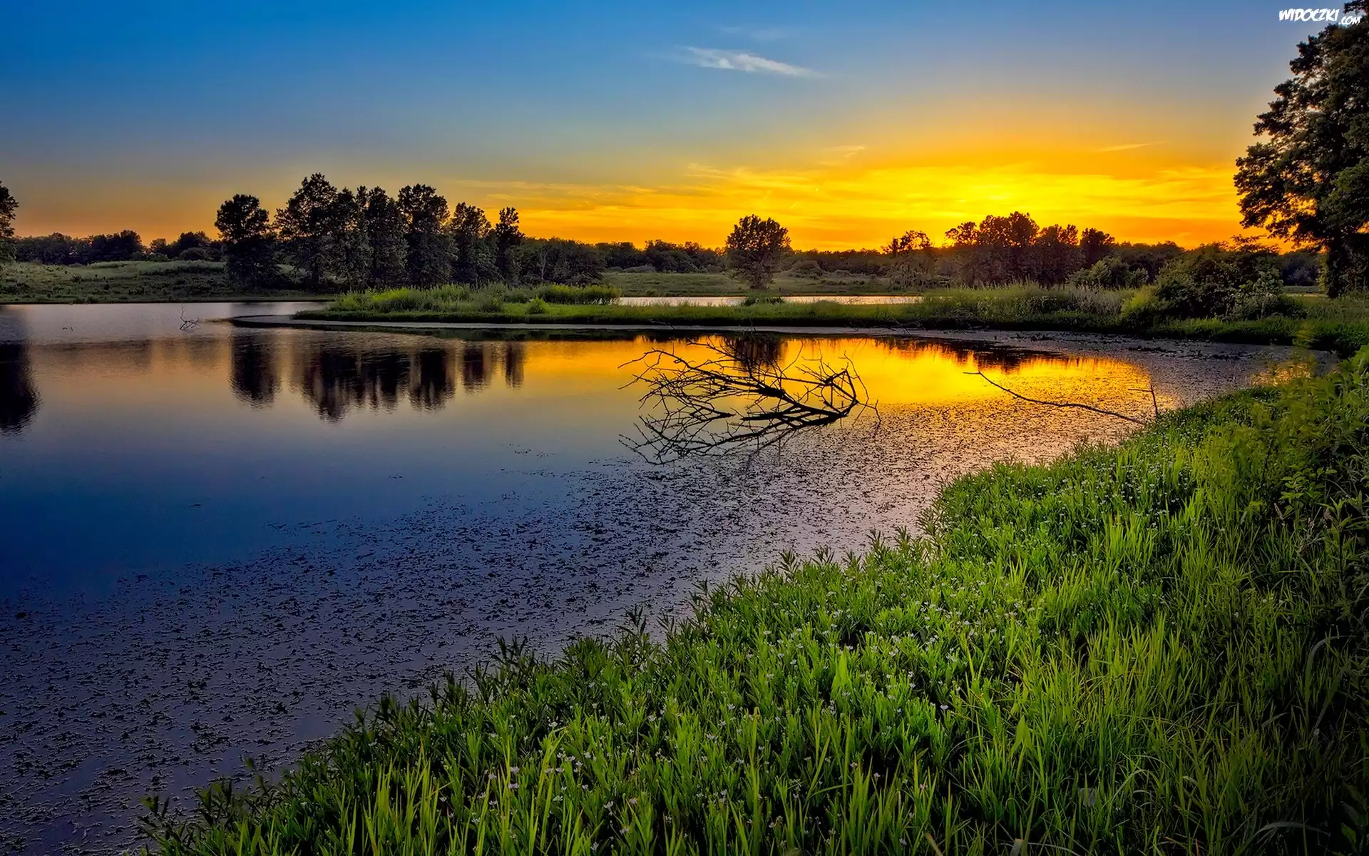 Zdjęcia, Zachód, Słońca, Jezioro, Drzewa