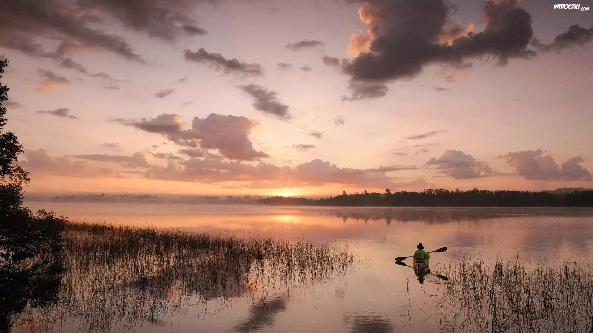 Zdjęcia, Zachód, Słońca, Jezioro, Kajakarz