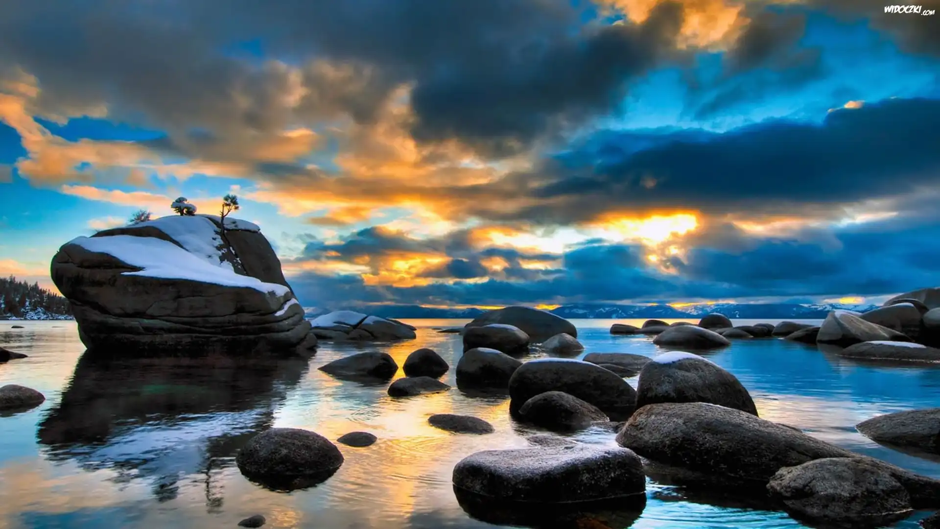 Zachód, Słońca, Jezioro, Kamienie