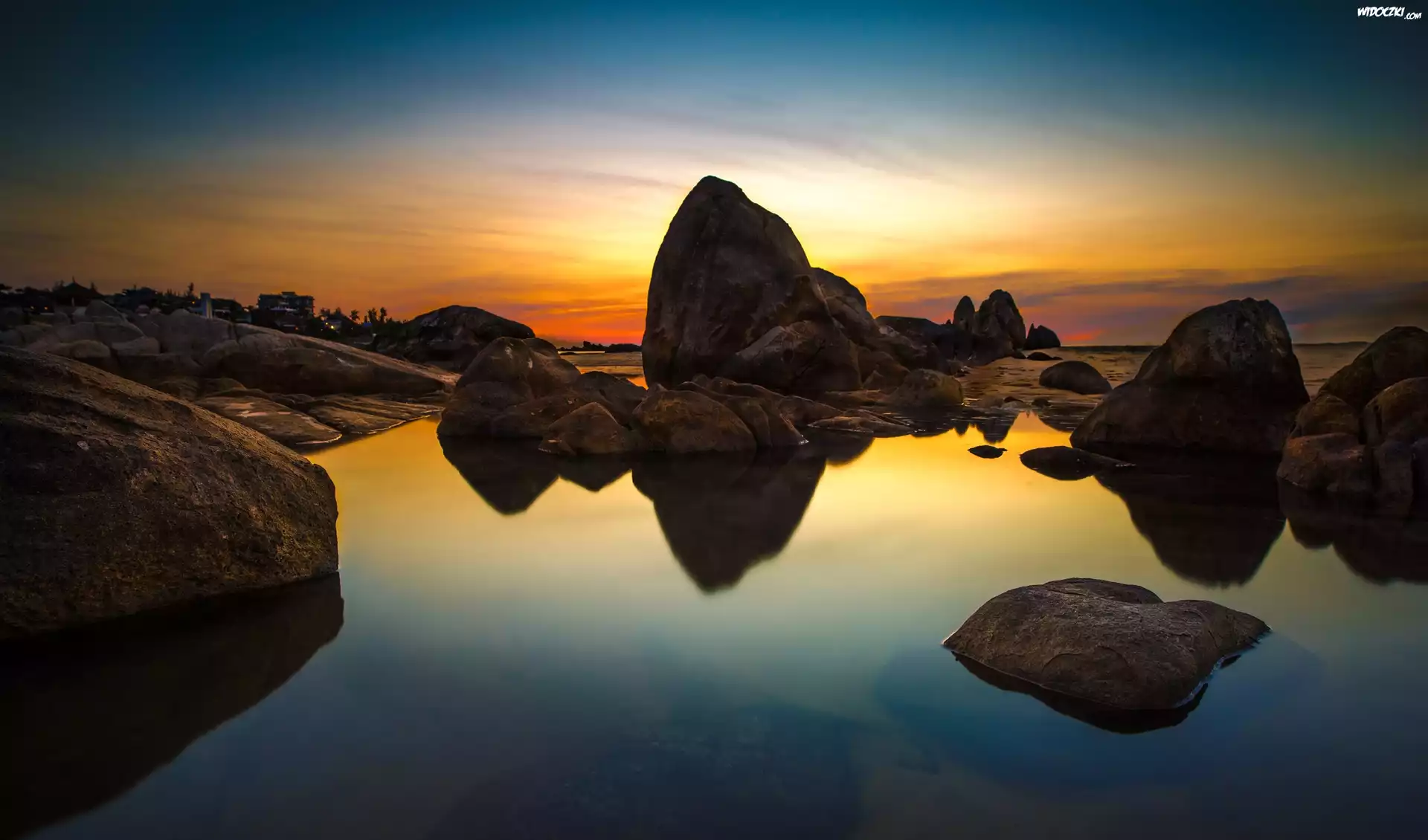 Zachód, Słońca, Jezioro, Kamienie