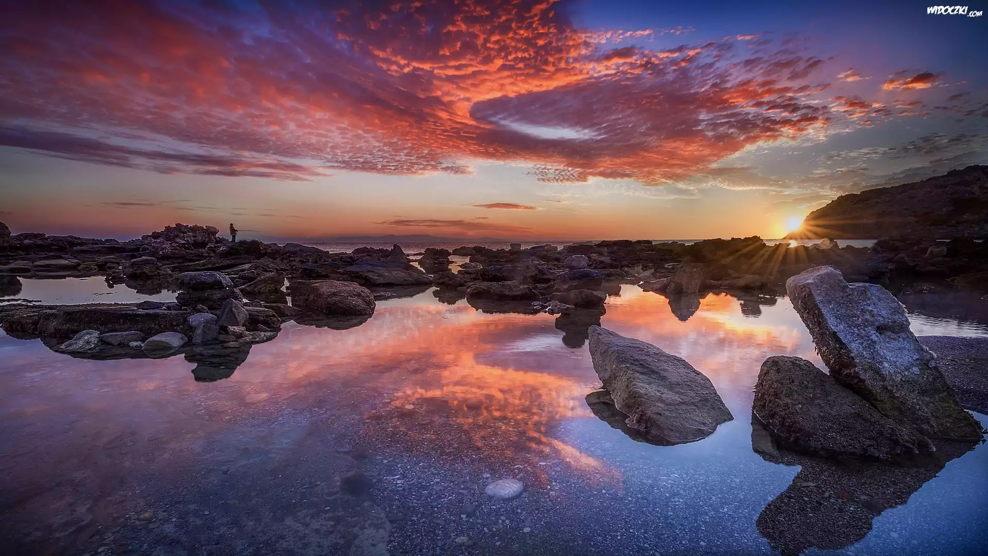 Zdjęcia, Zachód słońca, Jezioro, Kamienie
