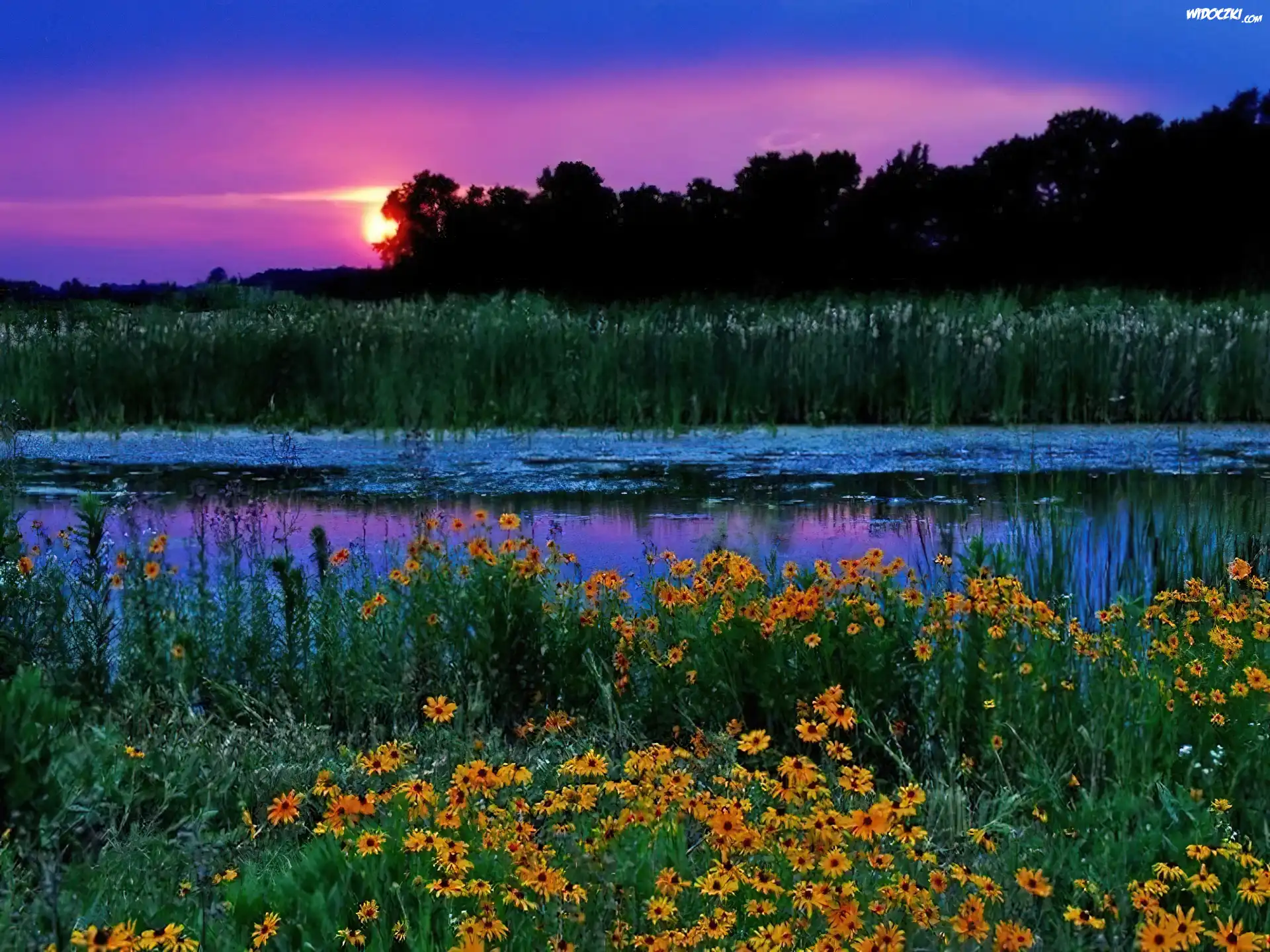 Zdjęcia, Zachód Słońca, Jezioro, Kwiaty
