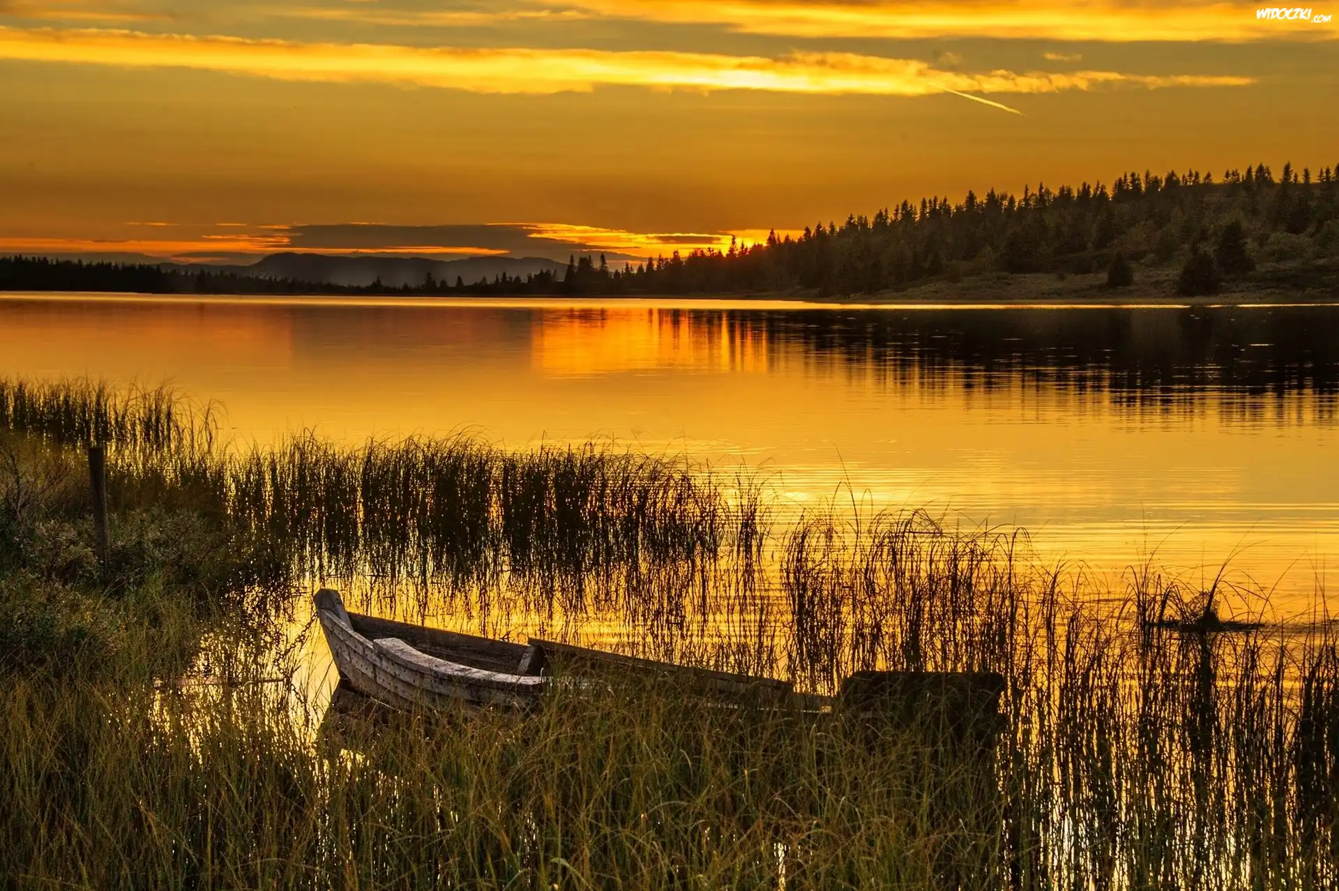 Zdjęcia, Zachód, Słońca, Jezioro, Łódka