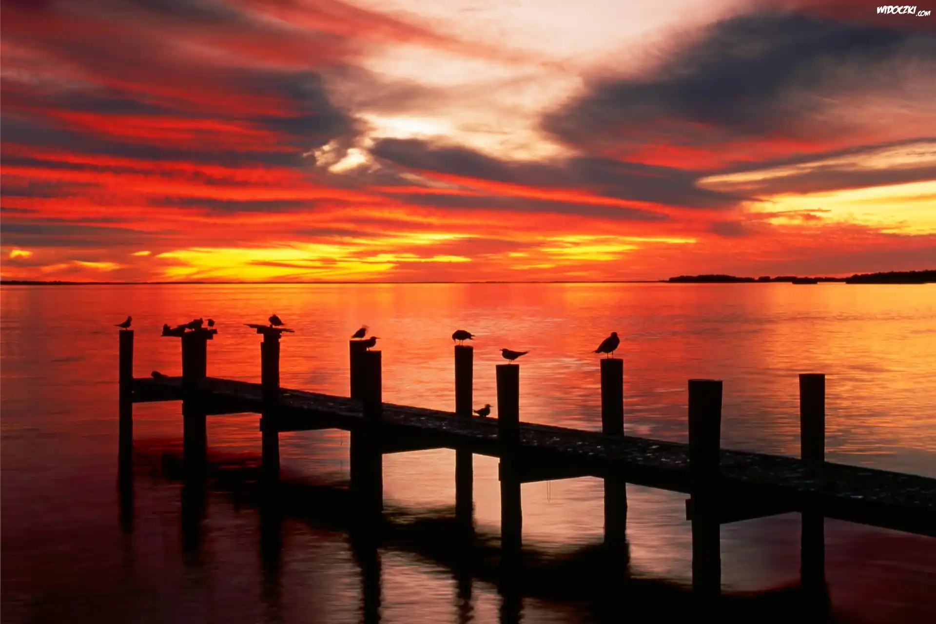 Zdjęcia, Zachód, Słońca, Jezioro, Ptaki