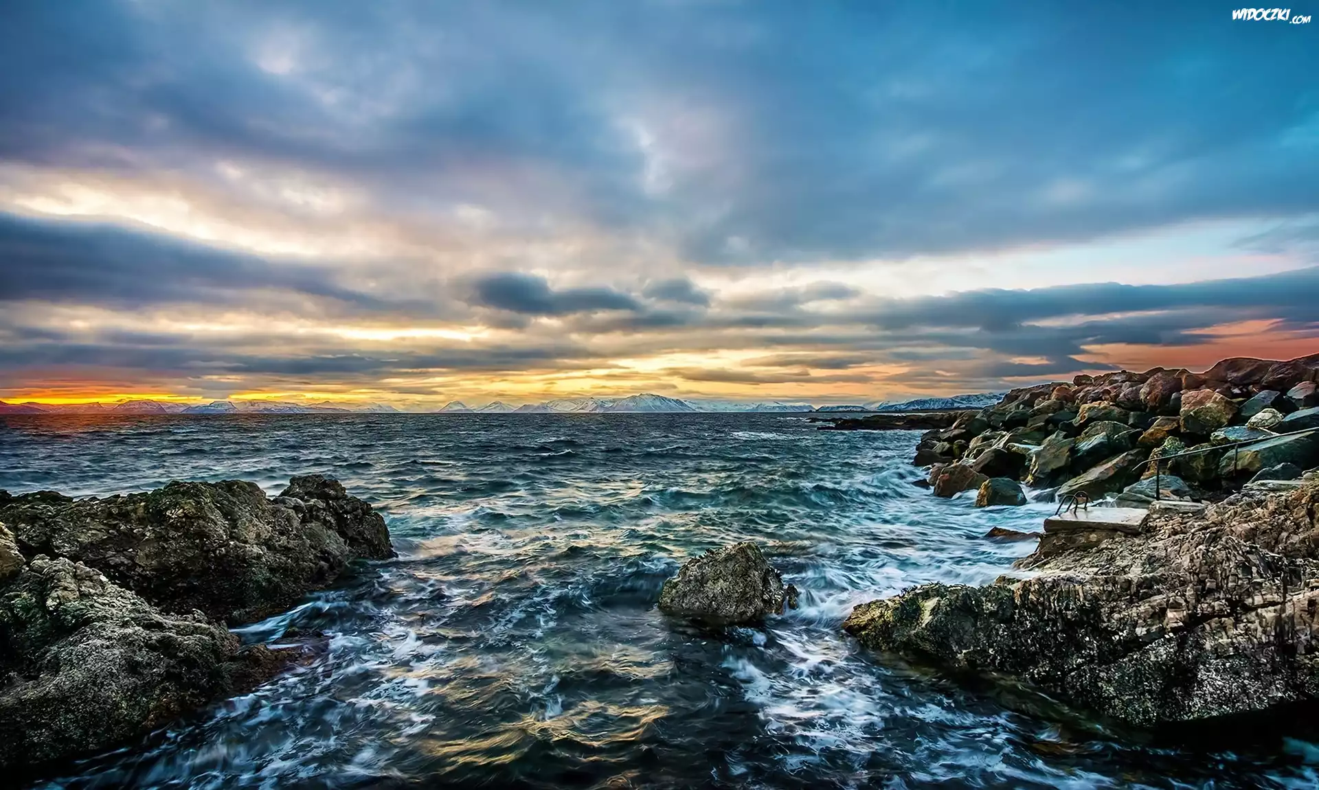 Zdjęcia, Zachód, Słońca, Jezioro, Skały