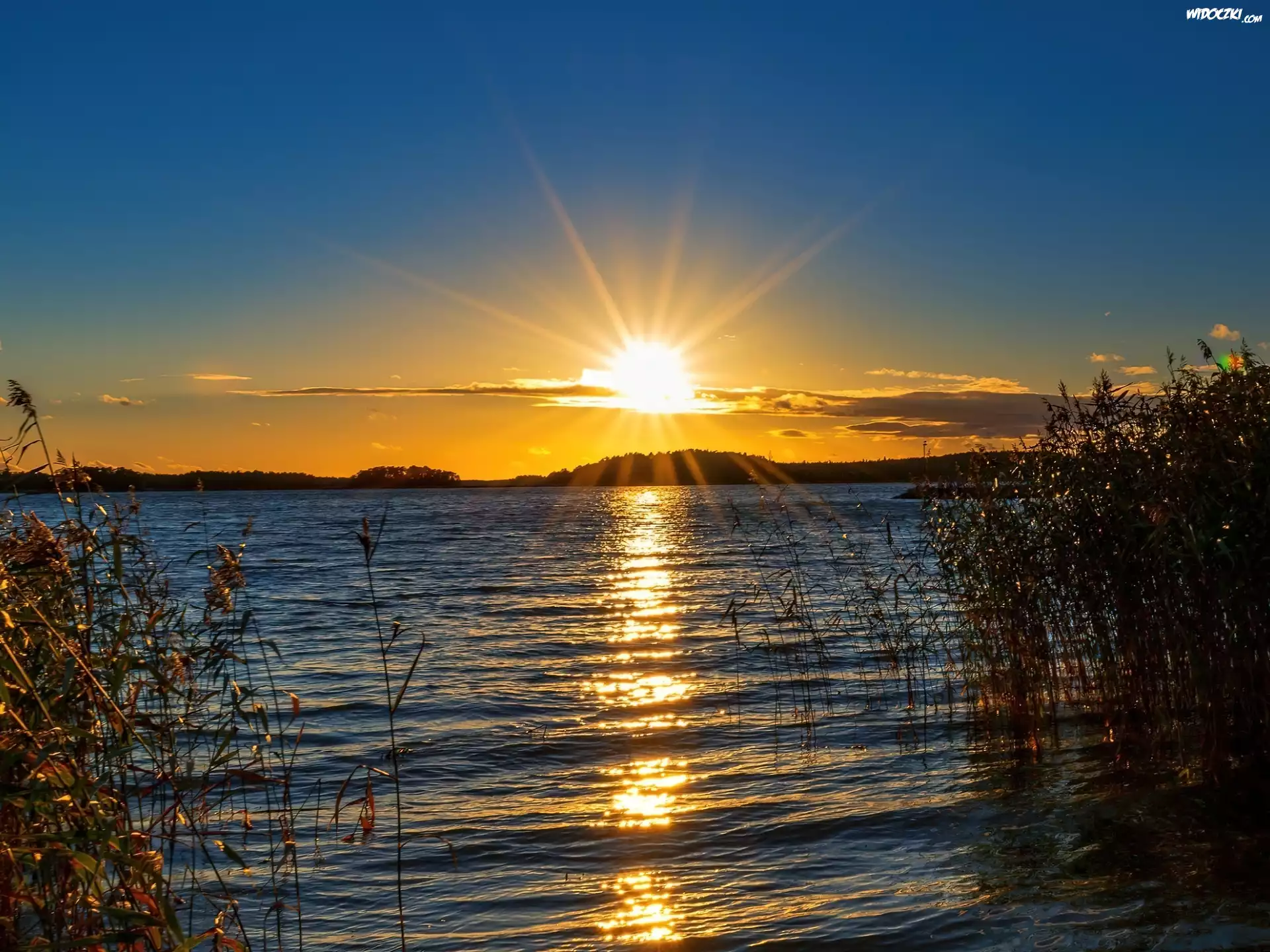 Zdjęcia, Zachód, Słońca, Jezioro, Szuwary