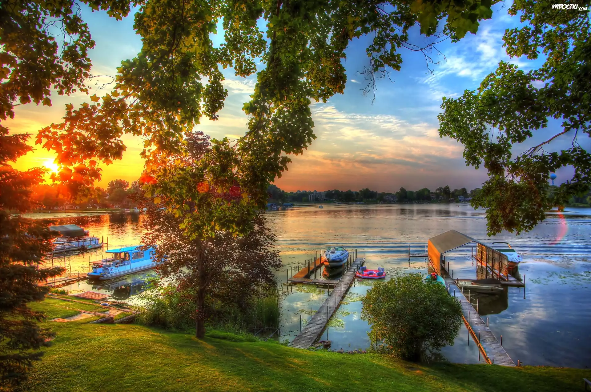 Zdjęcia, Jezioro, Zachód, Słońca, Drzewa, Przystań, Motorówka, Stateczek