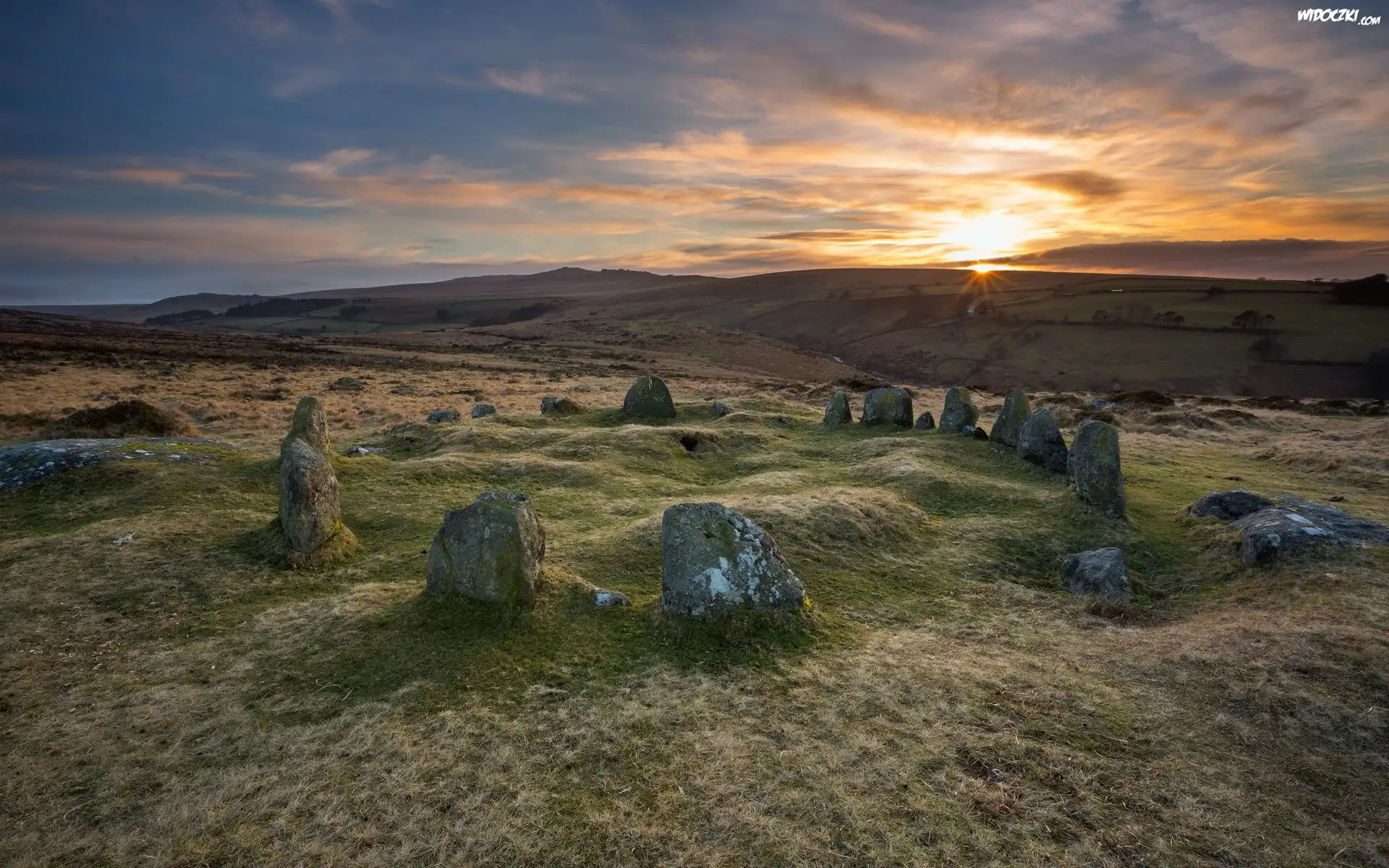 Zdjęcia, Łąka, Kamienie, Zachód Słońca
