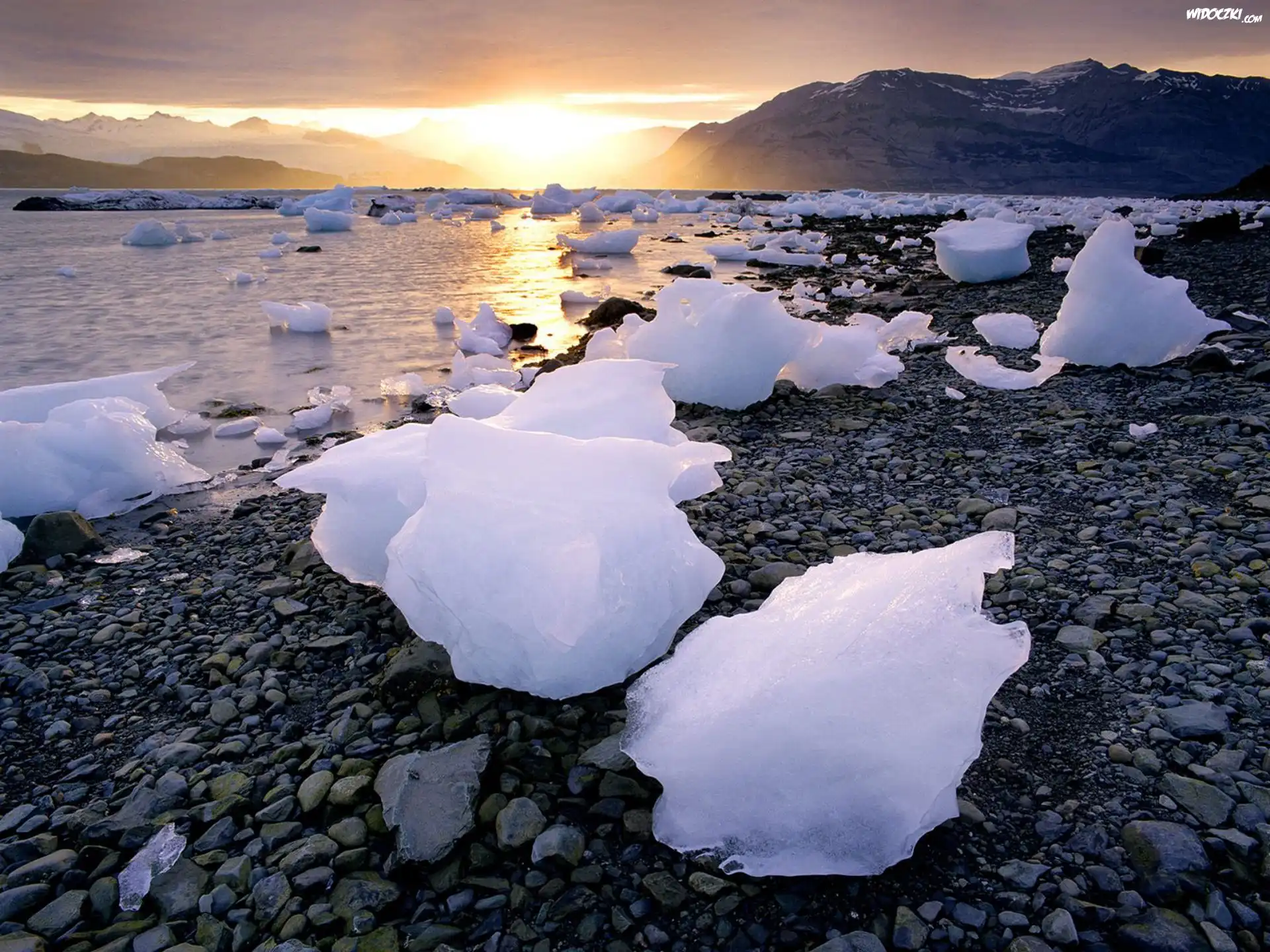 Zdjęcia, Zachód Słońca, Jezioro, Kamienie, Lód