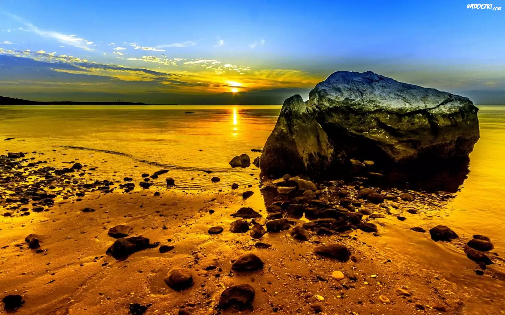 Zdjęcia, Zachód, Słońca, Jezioro, Kamienie, Plaża