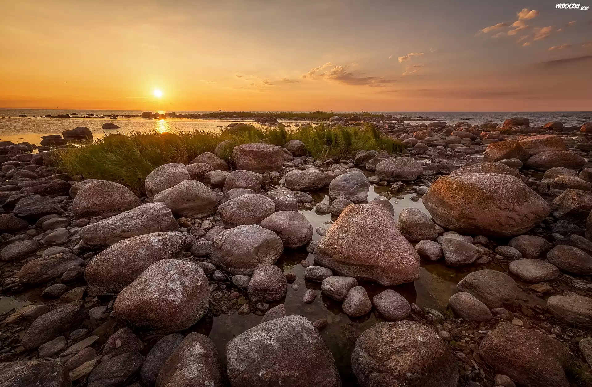 Zdjęcia, Zachód słońca, Morze, Brzeg, Kamienie, Rośliny