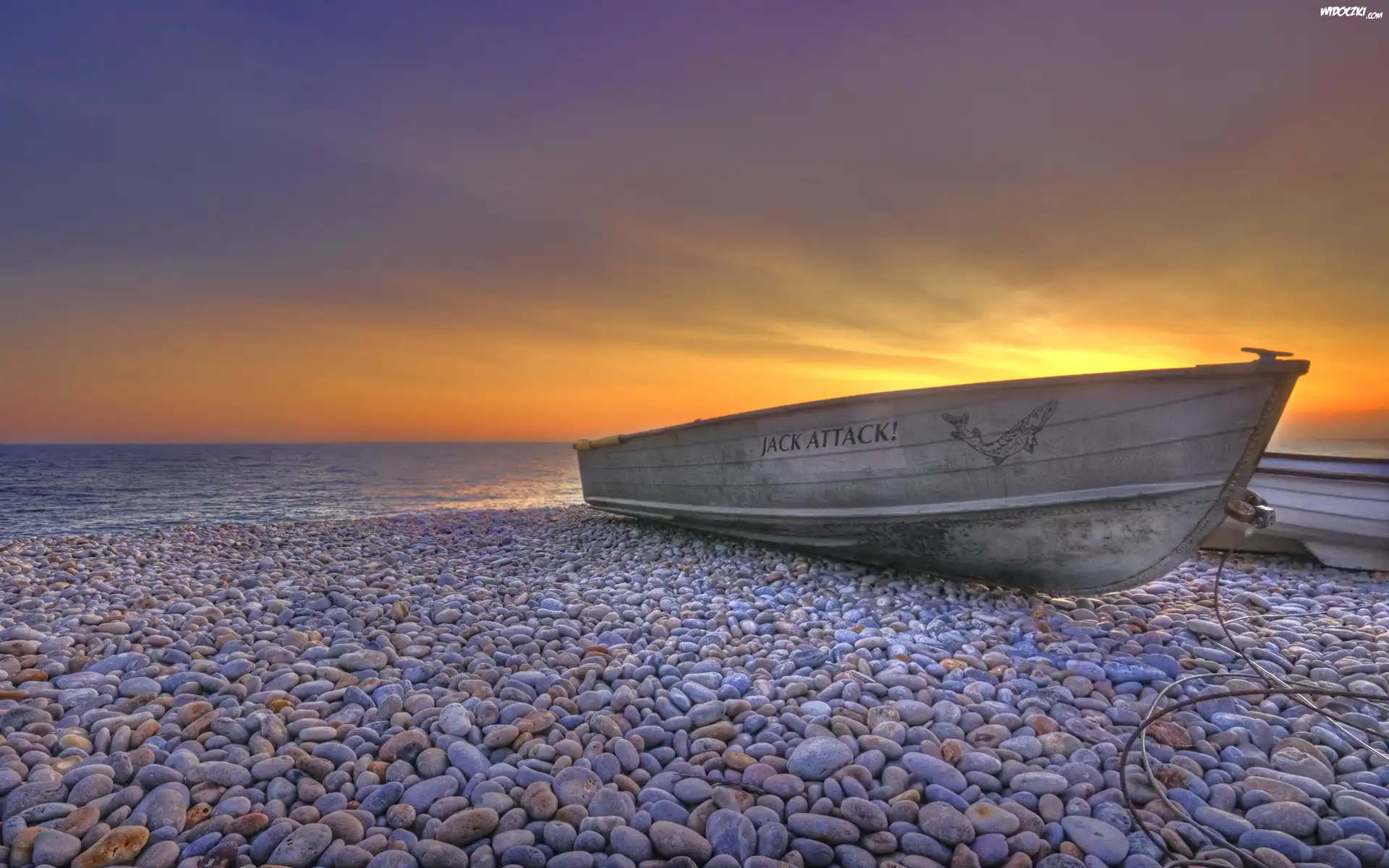 Zdjęcia, Zachód, Słońca, Morze, Plaża, Kamienie, Łódka