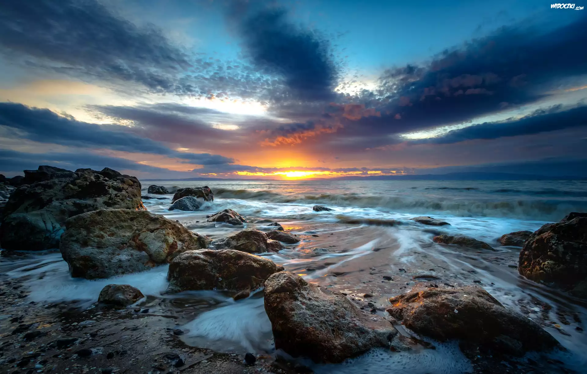 Zdjęcia, Zachód słońca, Morze, Kamienie, Chmury
