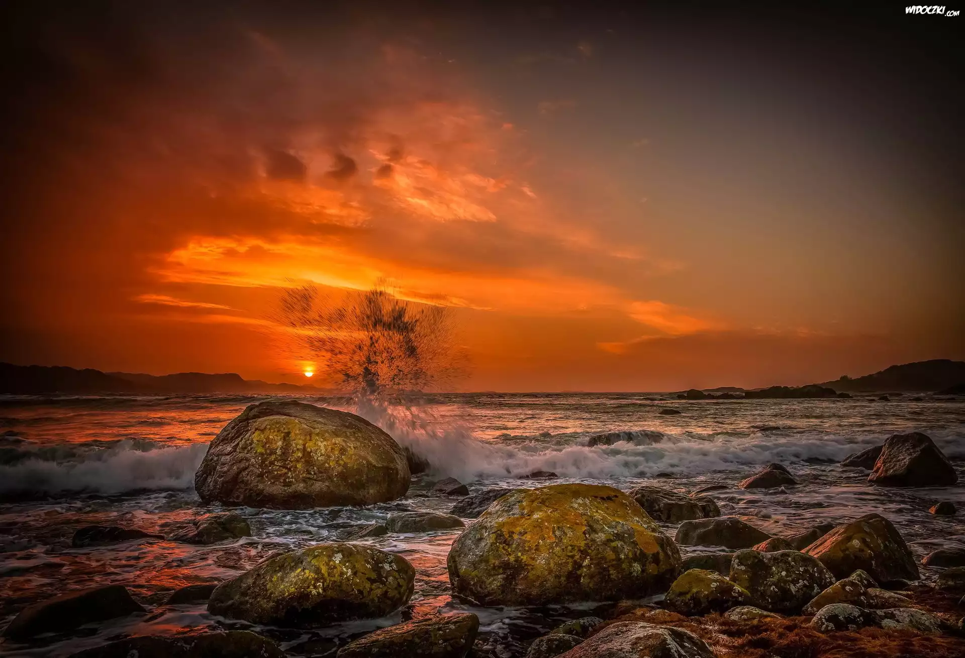 Zdjęcia, Zachód, Słońca, Morze, Kamienie, Fale