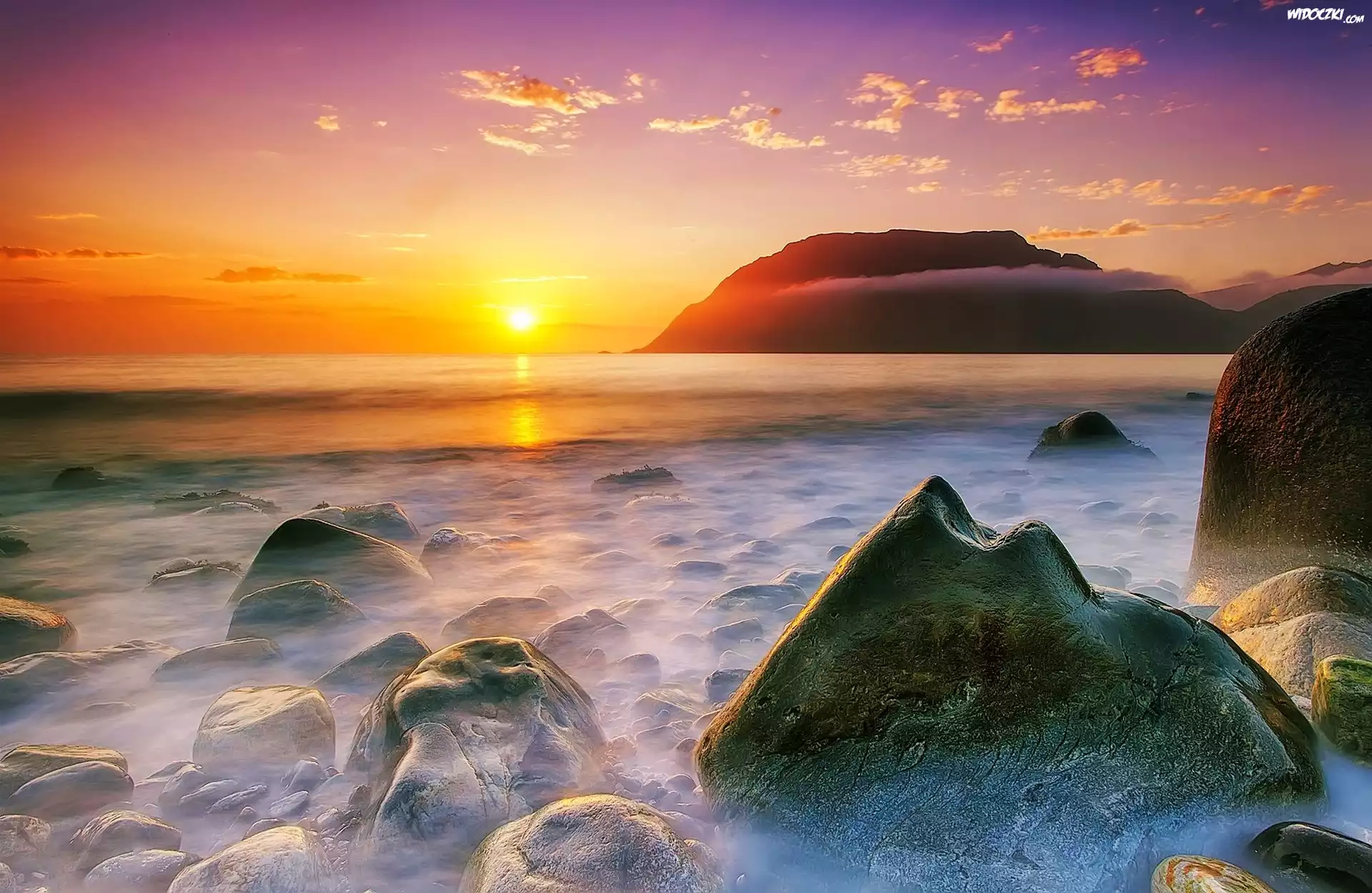 Zdjęcia, Zachód, Słońca, Morze, Kamienie, Góry