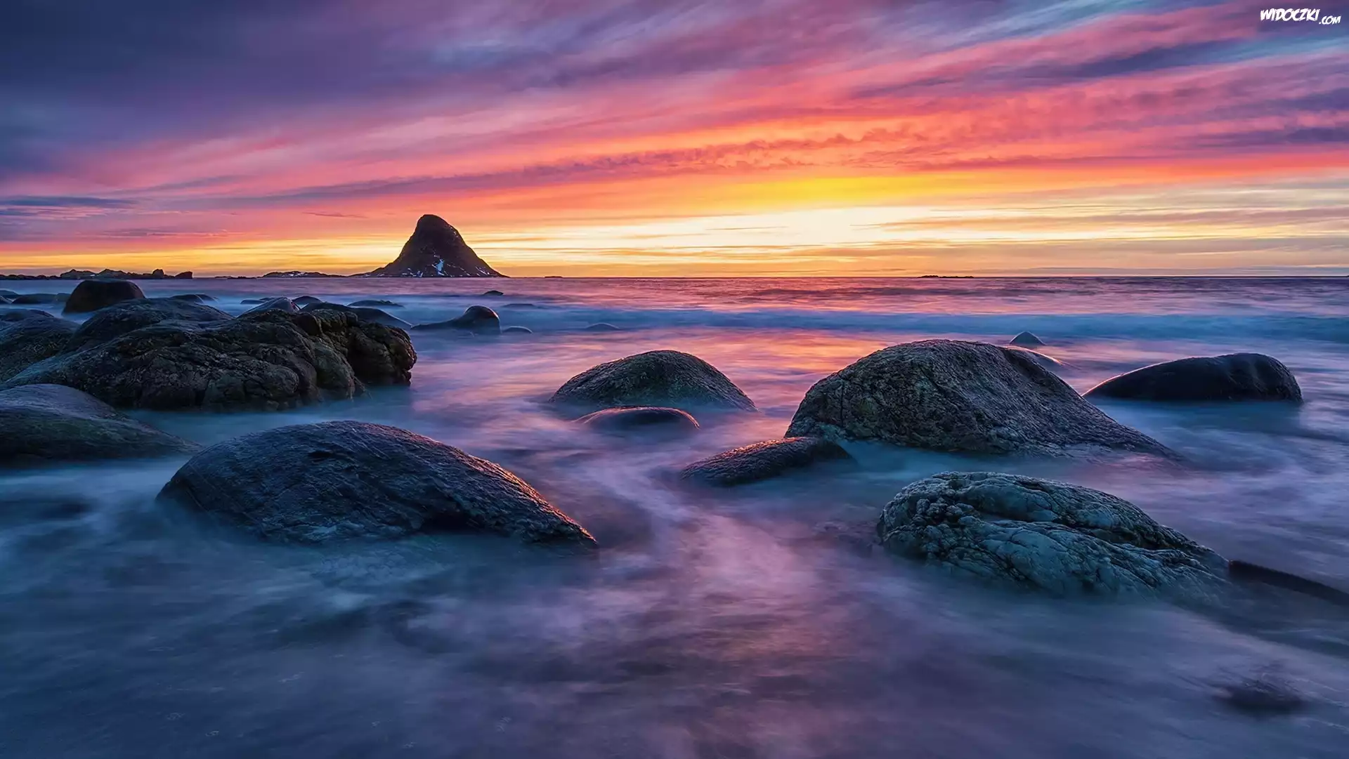 Zdjęcia, Zachód, Słońca, Morze, Kamienie, Niebo