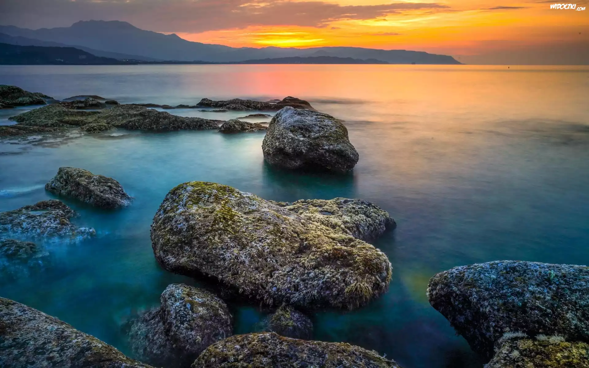 Zdjęcia, Zachód Słońca, Morze, Kamienie, Wybrzeże
