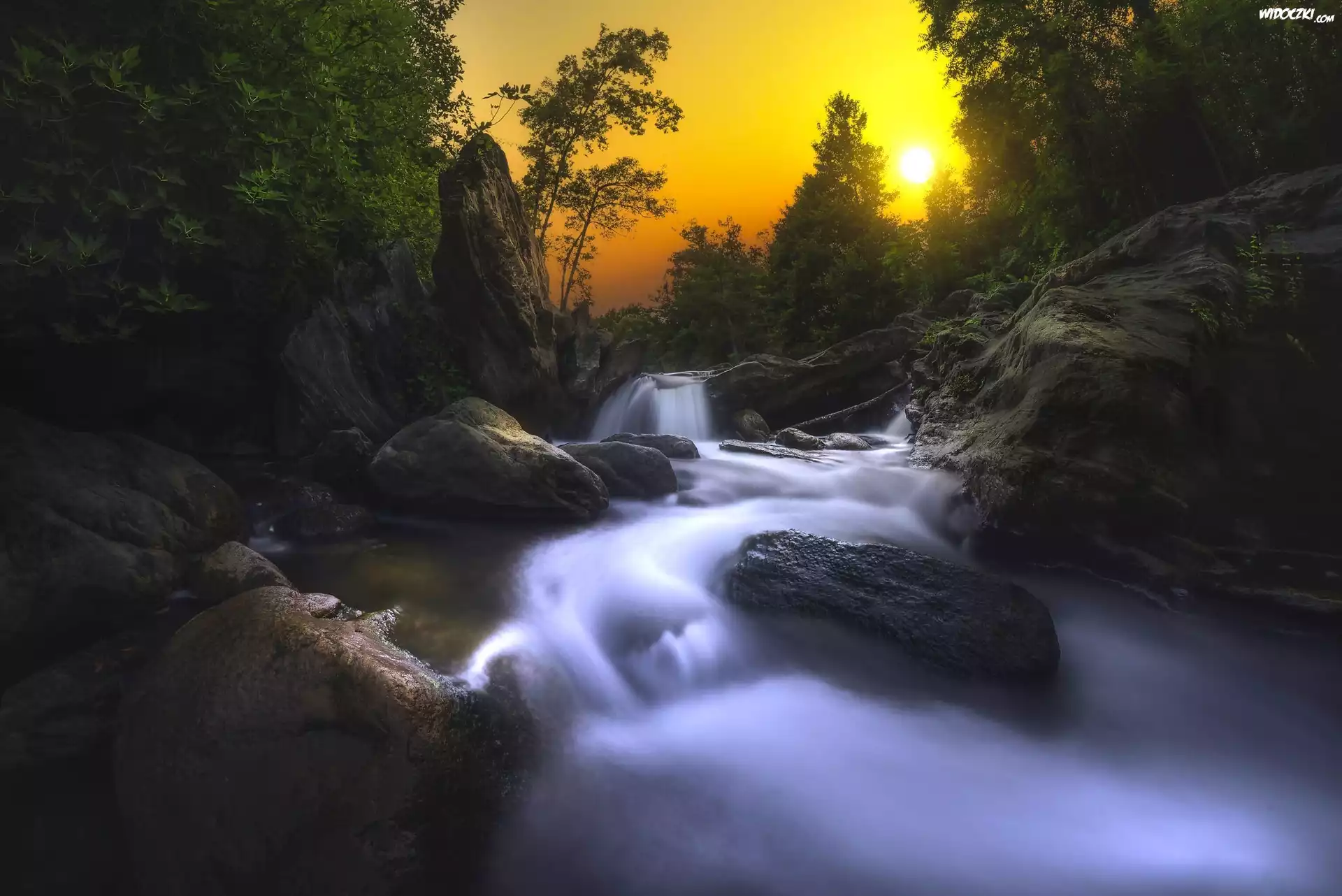 Zdjęcia, Zachód słońca, Rzeka, Kamienie, Drzewa