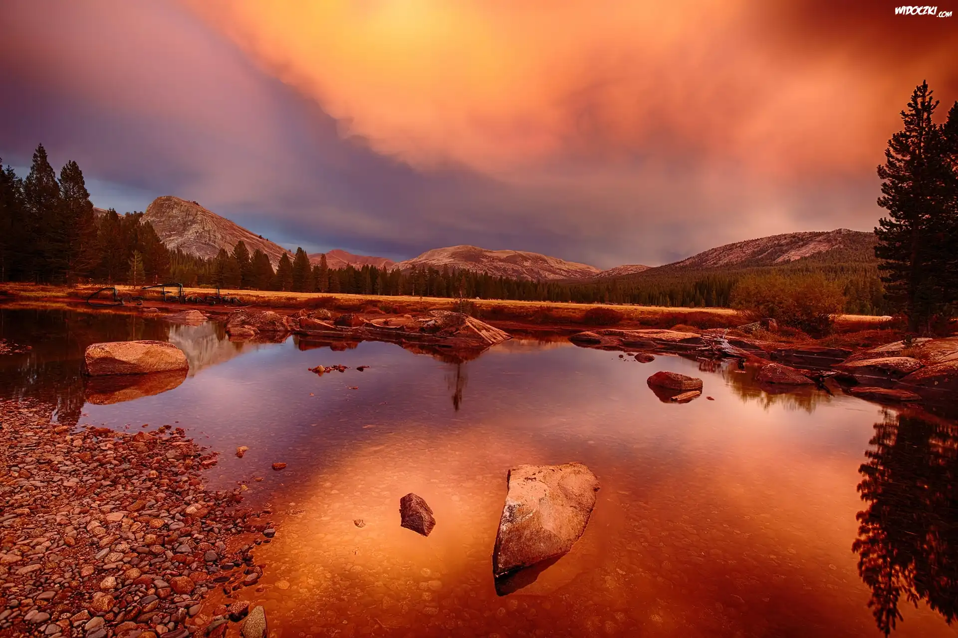 Zdjęcia, Zachód Słońca, Rzeka, Kamienie, Góry