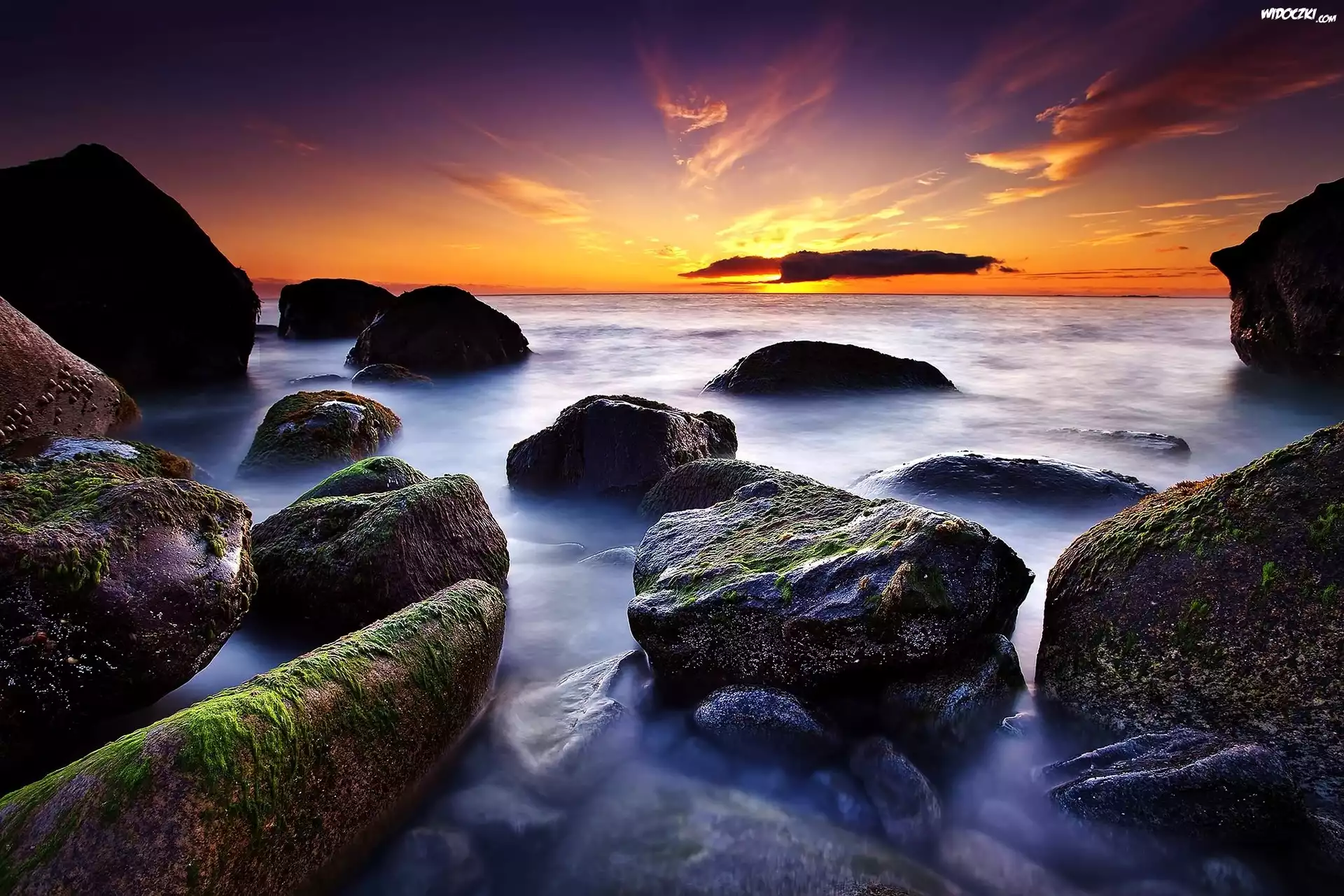 Zdjęcia, Zachód, Słońca, Kamienie, Morze