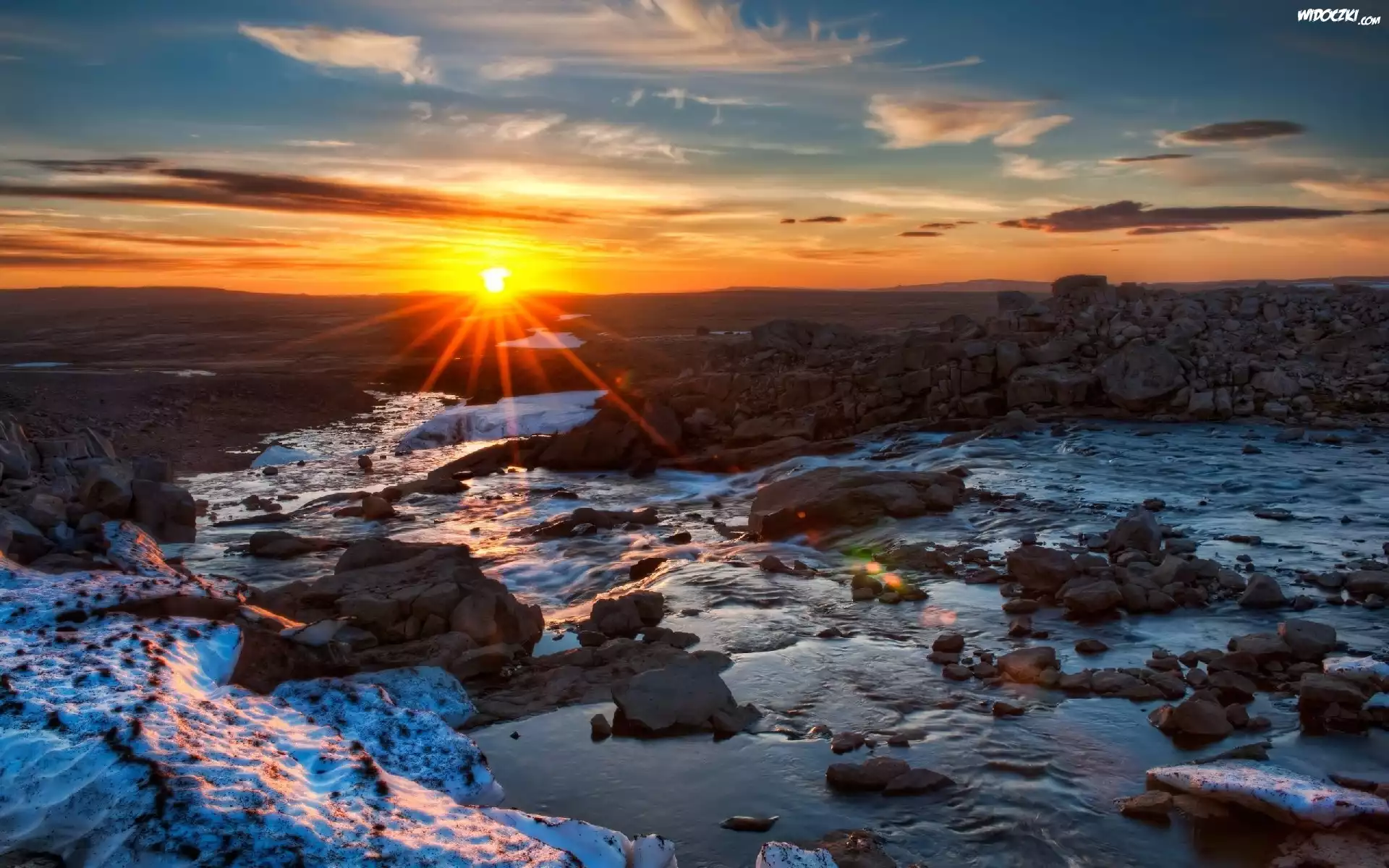 Zdjęcia, Zachód, Słońca, Kamienie, Rzeka