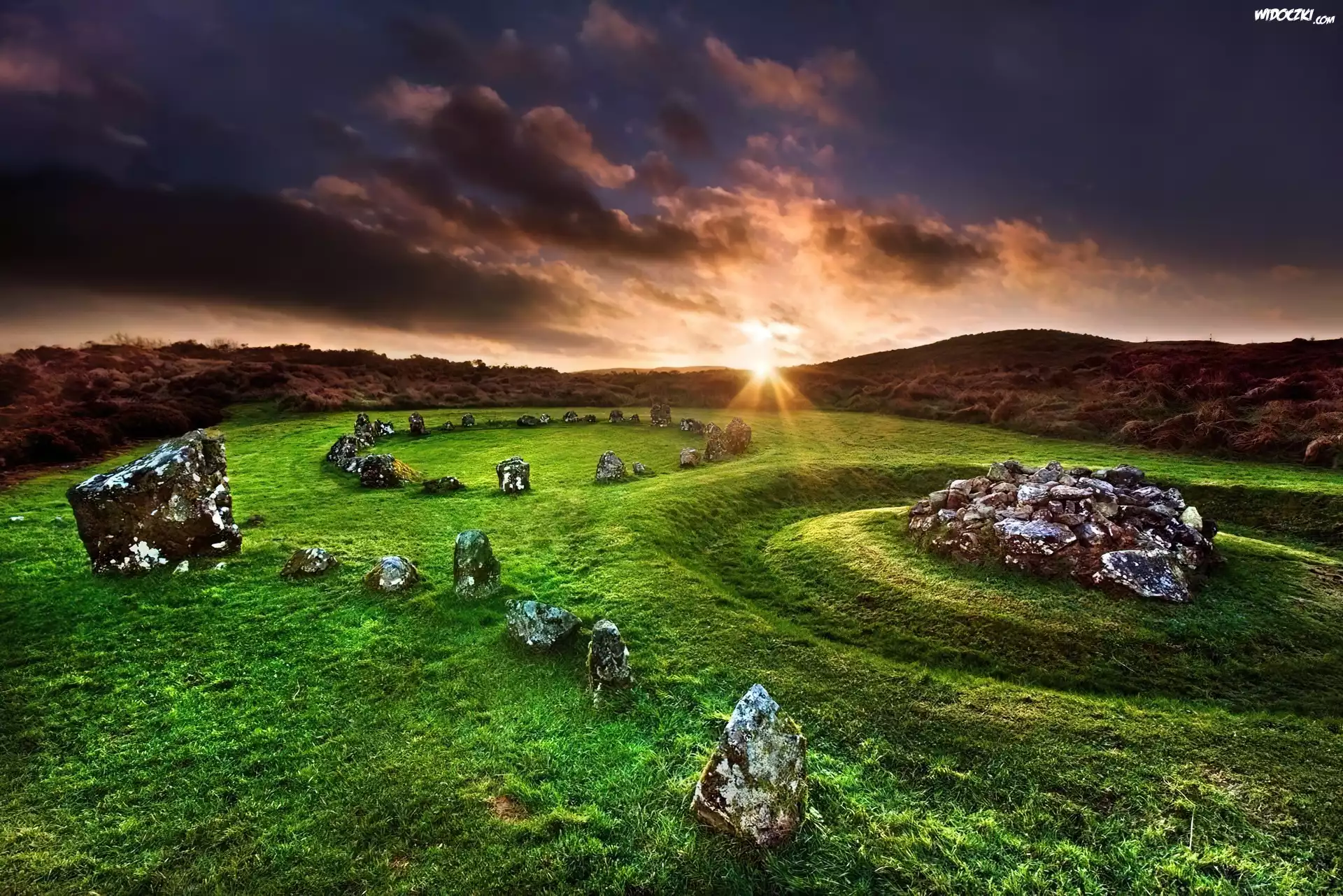 Zachód, Słońca, Kamienie, Trawa