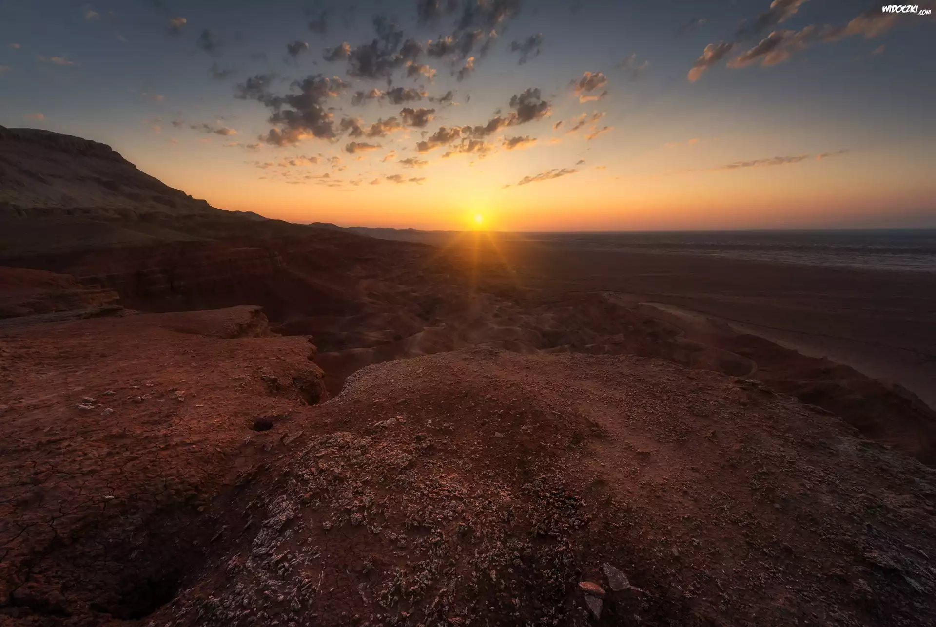 Zdjęcia, Zachód słońca, Wzgórza, Kamienie, Chmury