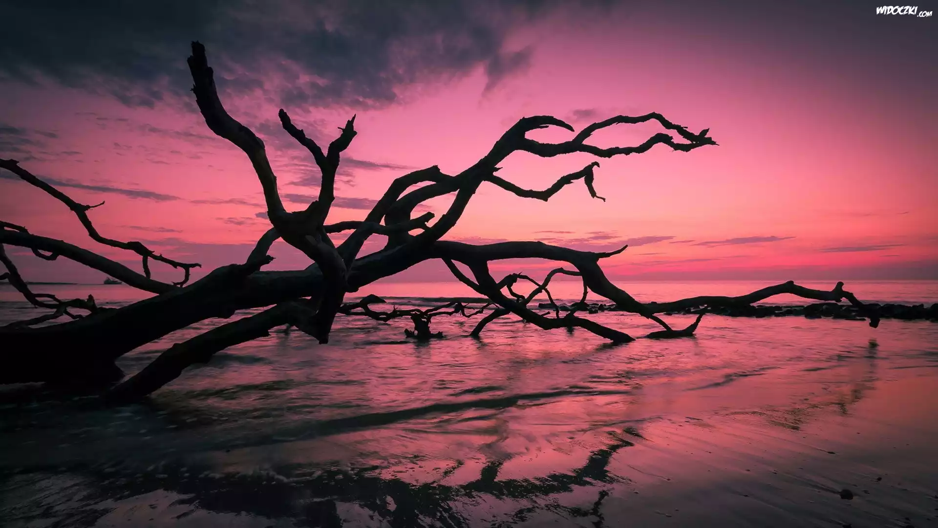 Zdjęcia, Zachód, Słońca, Morze, Konary, Drzewa