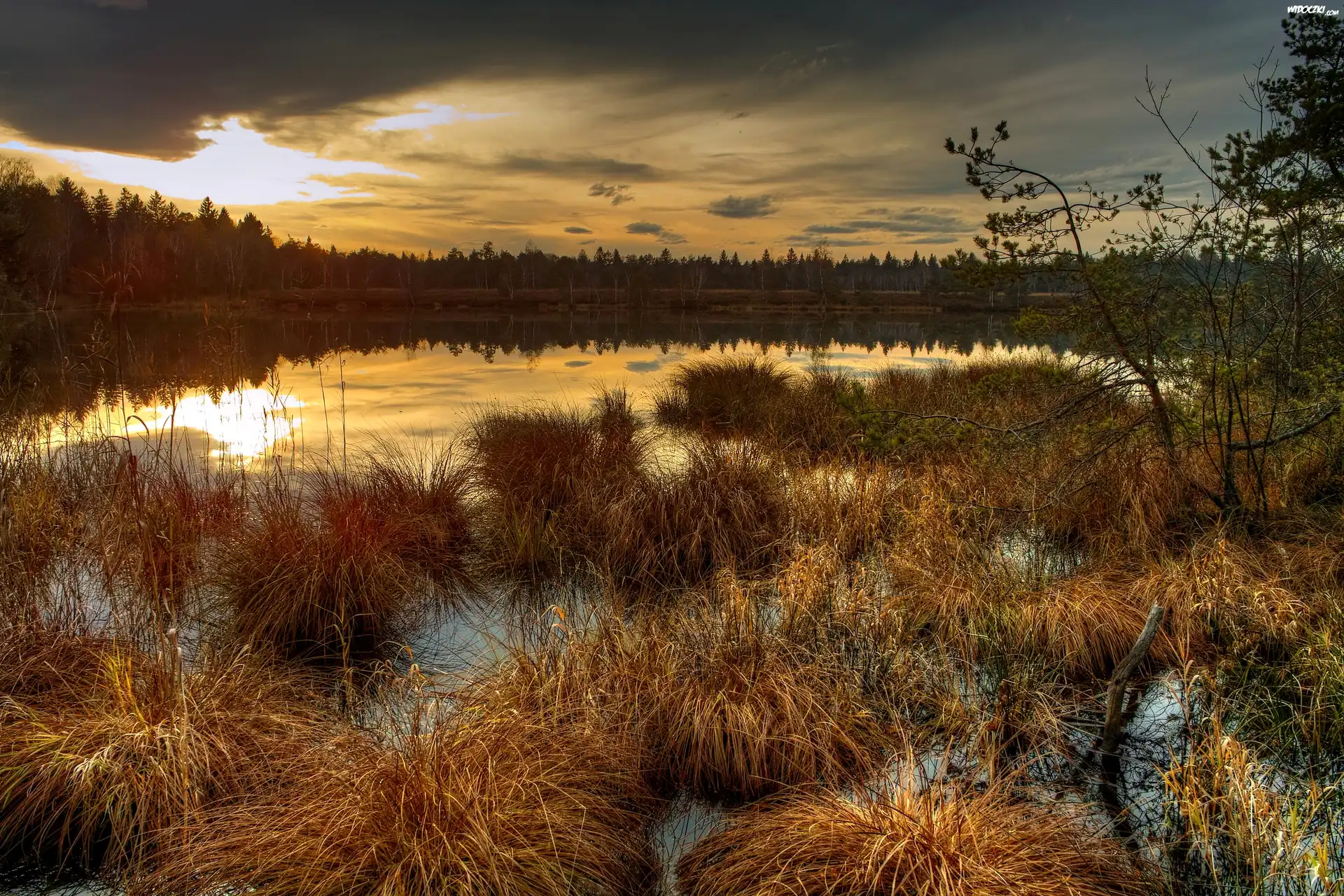 Zdjęcia, Zachód Słońca, Staw, Krzewy, Trawy