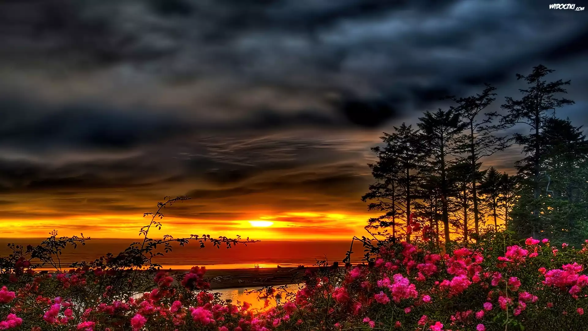 Zdjęcia, Zachód, Słońca, Kwiatki, Drzewa