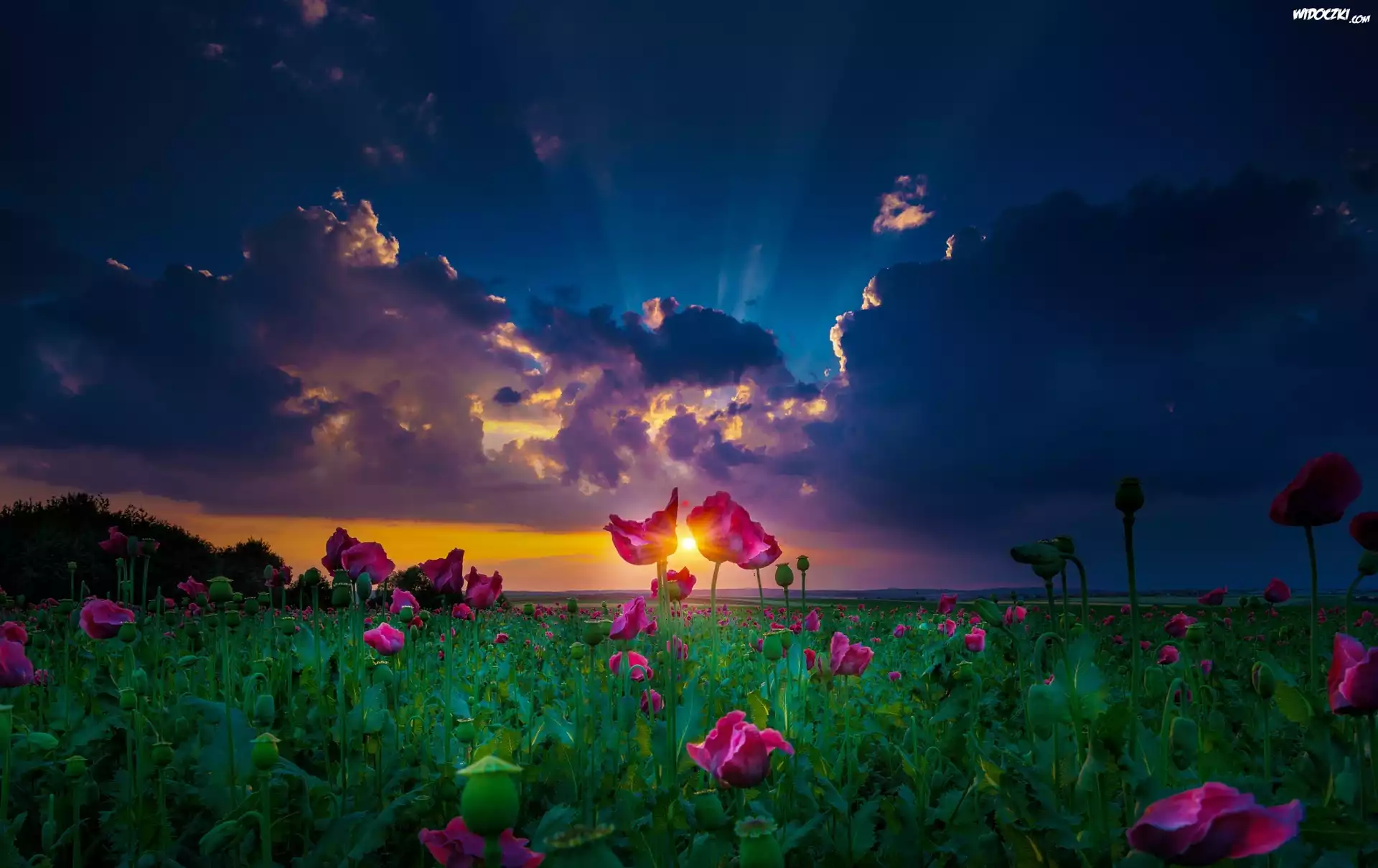 Zdjęcia, Zachód Słońca, Chmury, Kwiaty Maki