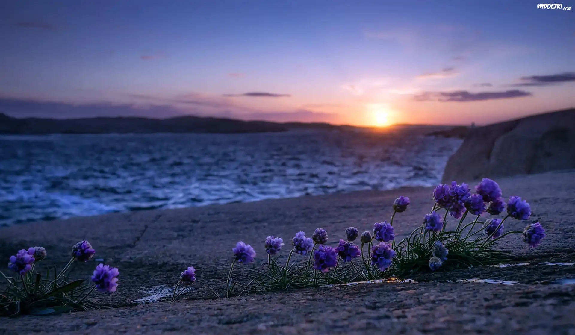 Zdjęcia, Zachód słońca, Jezioro, Kwiaty, Plaża