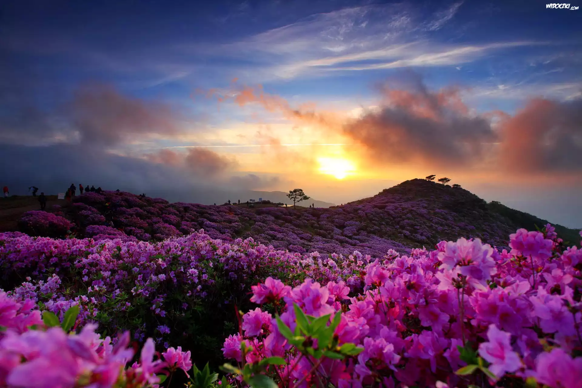 Zdjęcia, Zachód słońca, Kwiaty, Wzgórze
