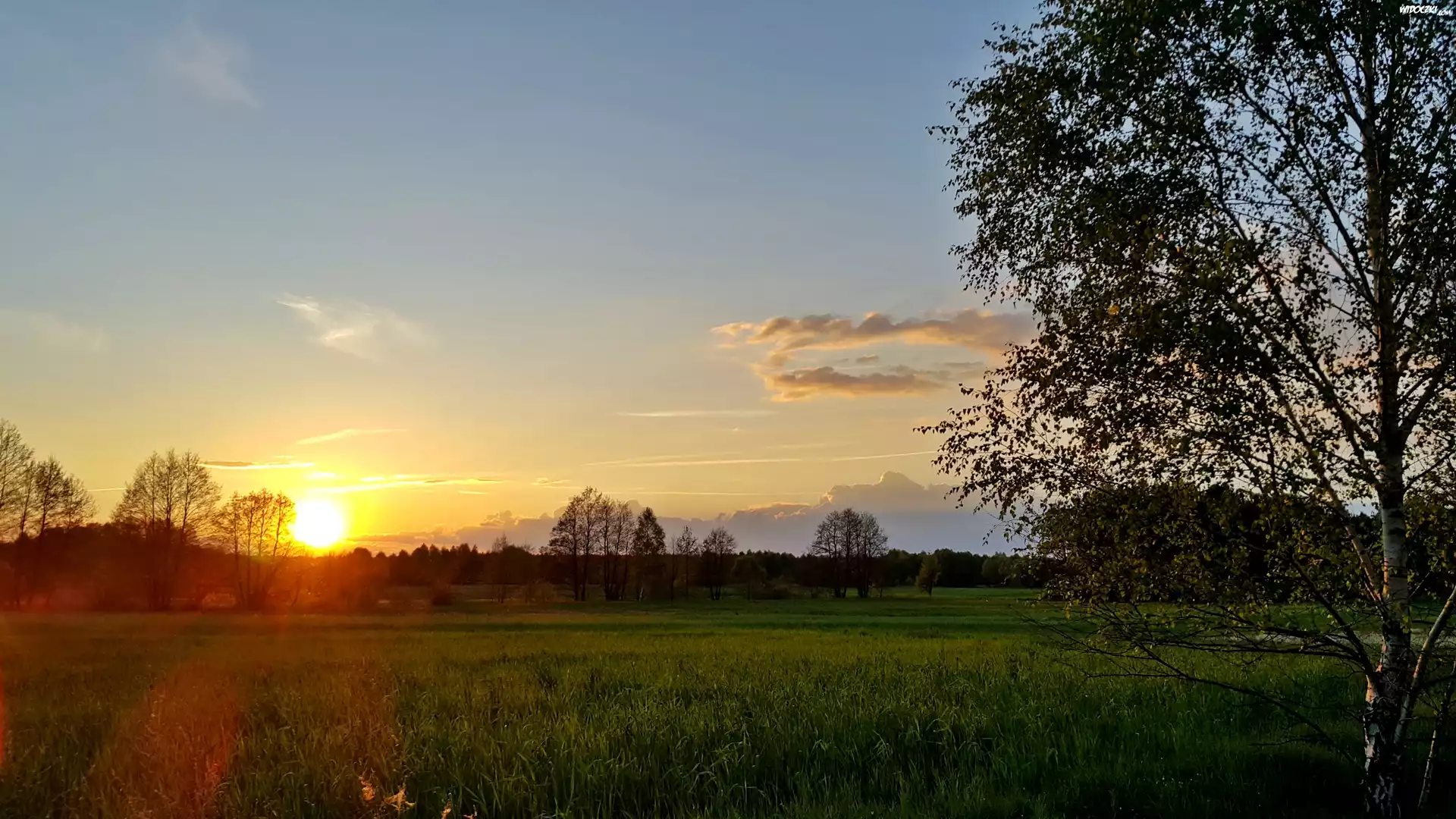 Zdjęcia, Łąka, Las. Brzoza, Zachód, Słońca