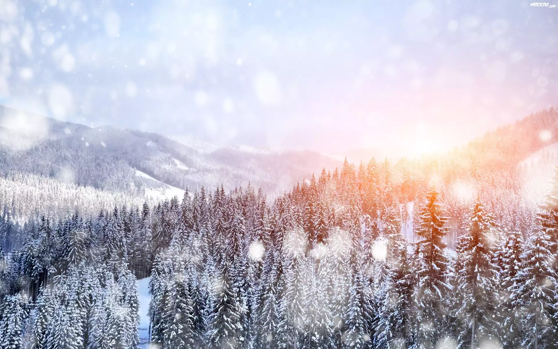 Zdjęcia, Zachód, Słońca, Góry, Las, Zima