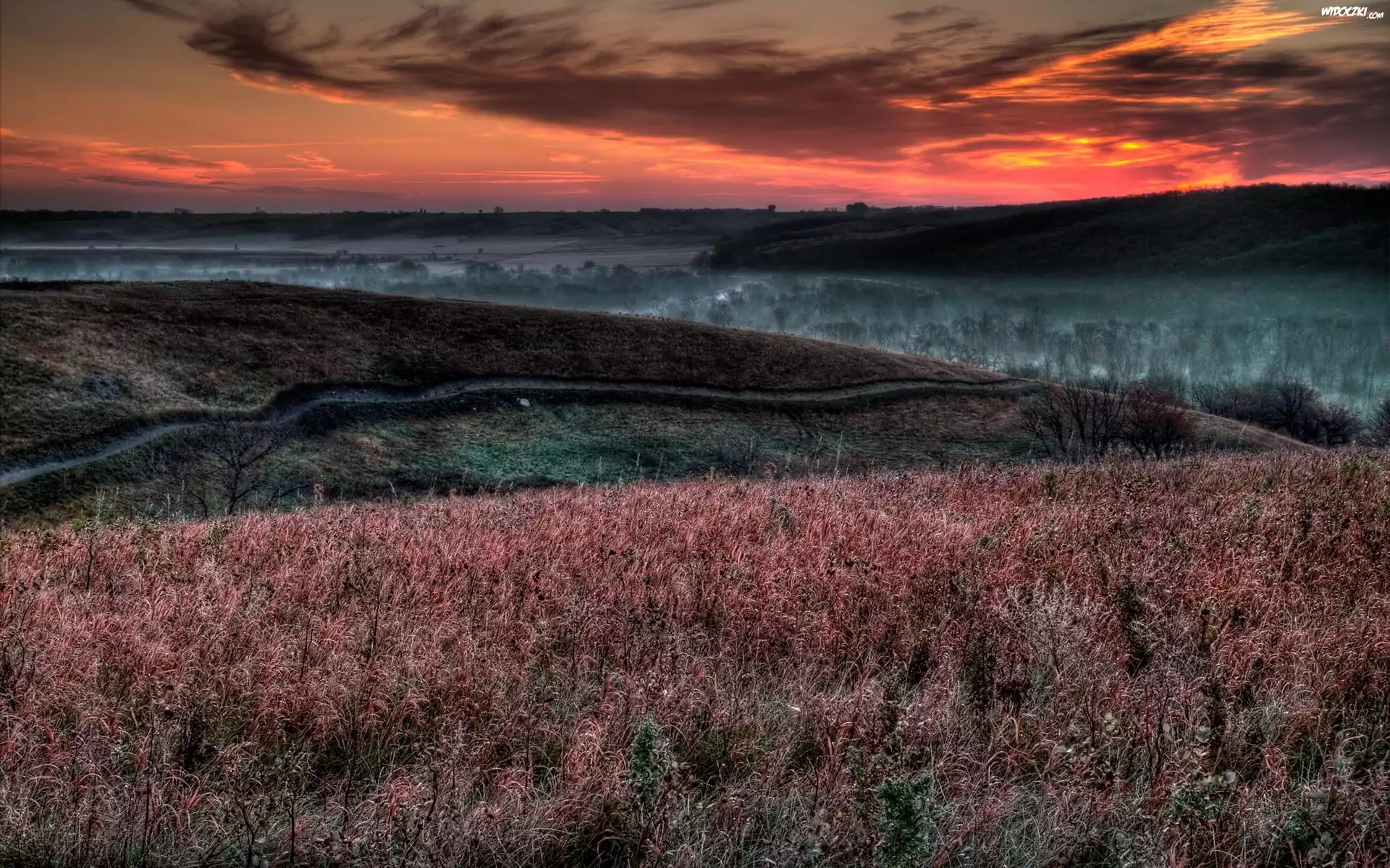 Zdjęcia, Łąka, Las, Niebo, Zachód Słońca