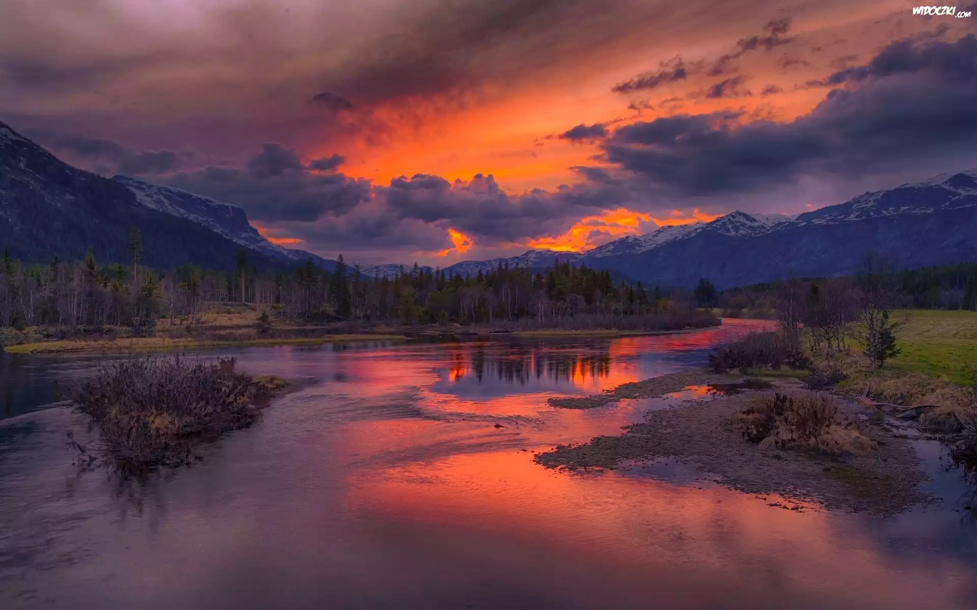 Zdjęcia, Zachód, Słońca, Rzeka, Las, Góry