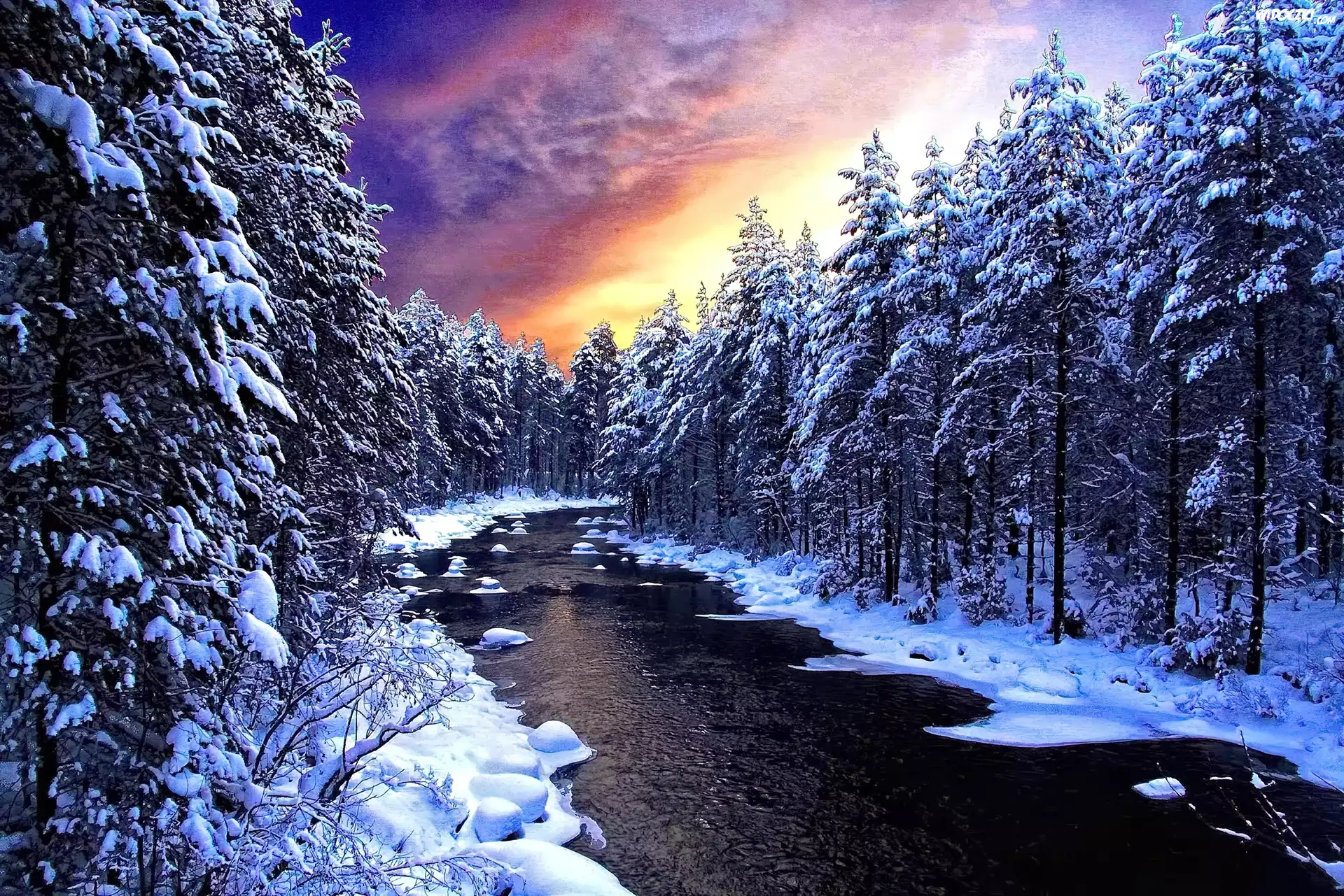 Zachód Słońca, Rzeka, Las, Zima