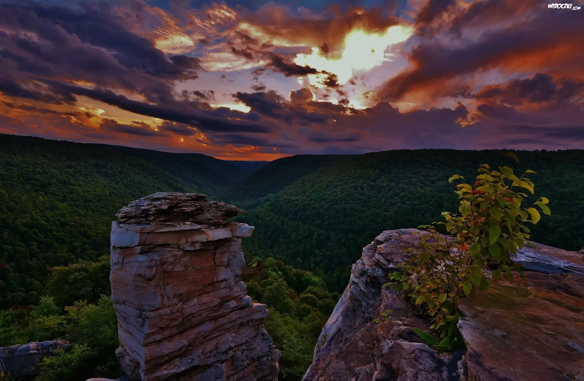 Zdjęcia, Zachód słońca, skały, las, chmury