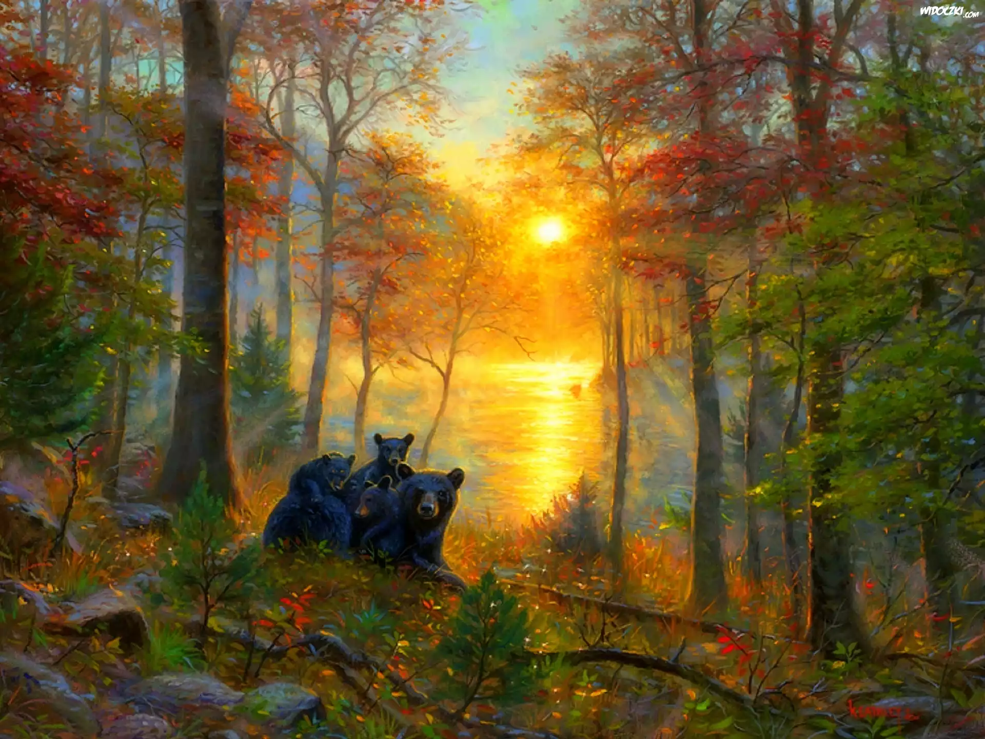 Zdjęcia, Zachód, Słońca, Las, Misie