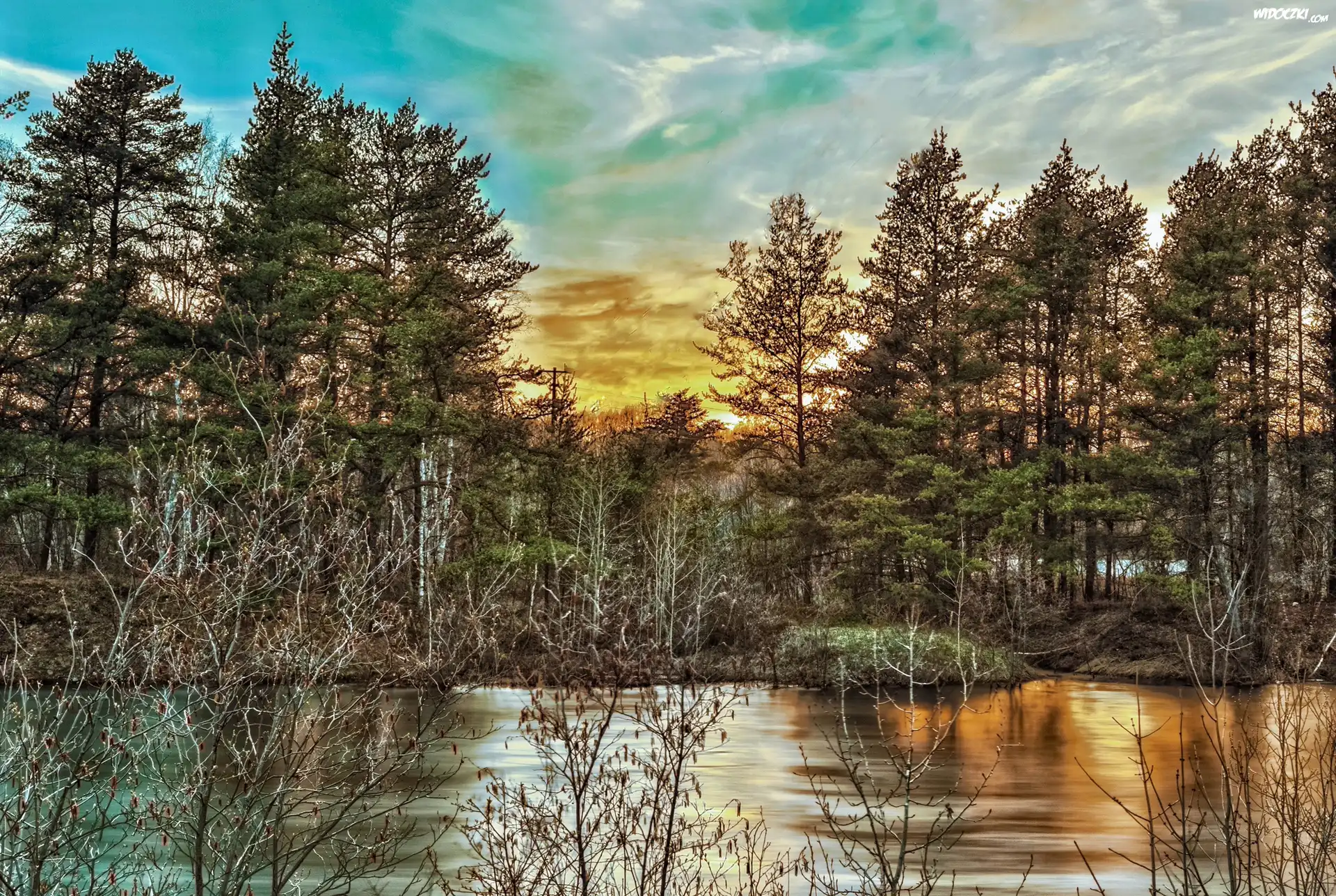 Zdjęcia, Zachód, Słońca, Las, Rzeka