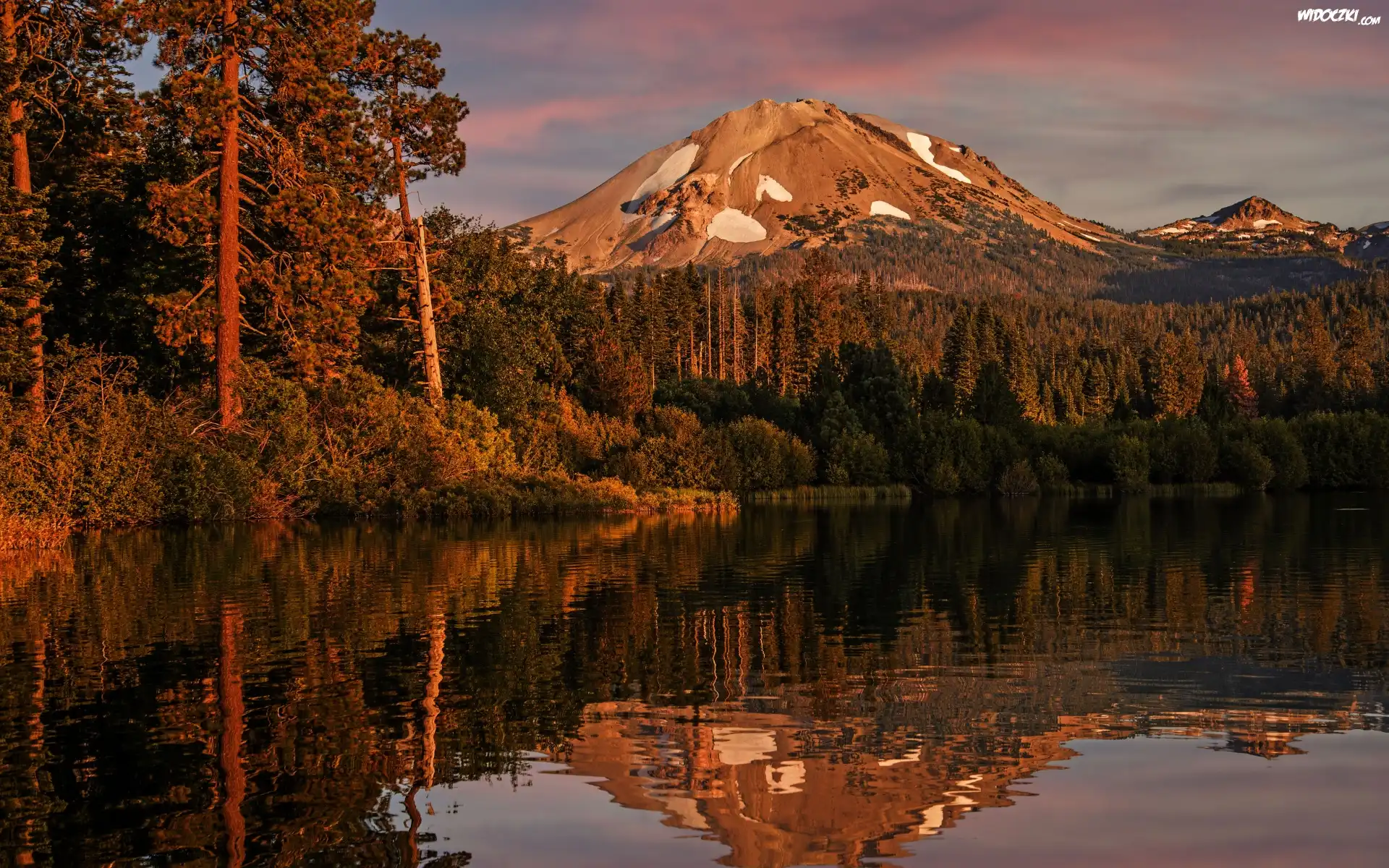 Zachód słońca, Góry Kaskadowe, Wulkan Lassen Peak, Park Narodowy Lassen Volcanic, Jezioro, Drzewa, Las, Kalifornia, Stany Zjednoczone |