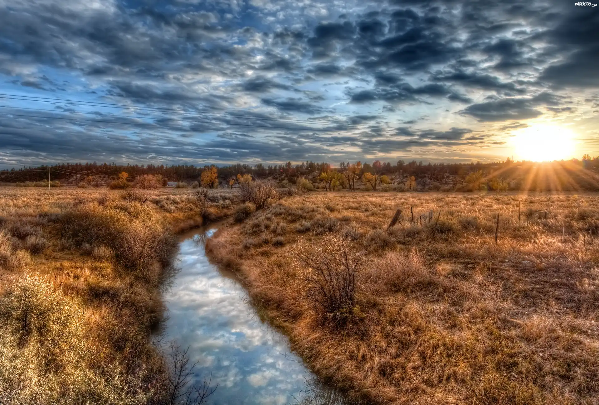 Zdjęcia, Zachód, Słońca, Pola, Lasy, Rzeka