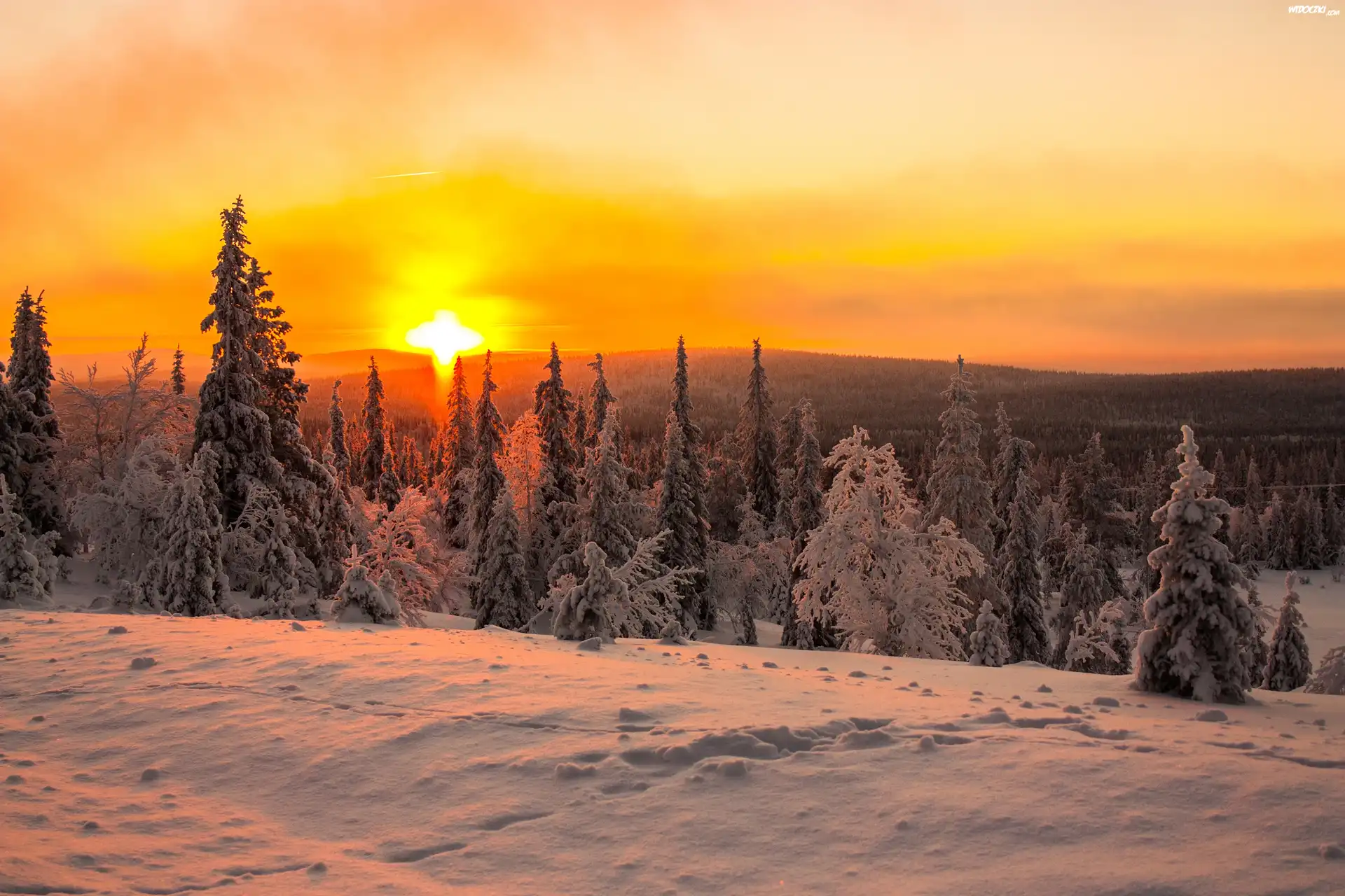 Zdjęcia, Zachód, Słońca, Lasy, Śnieg
