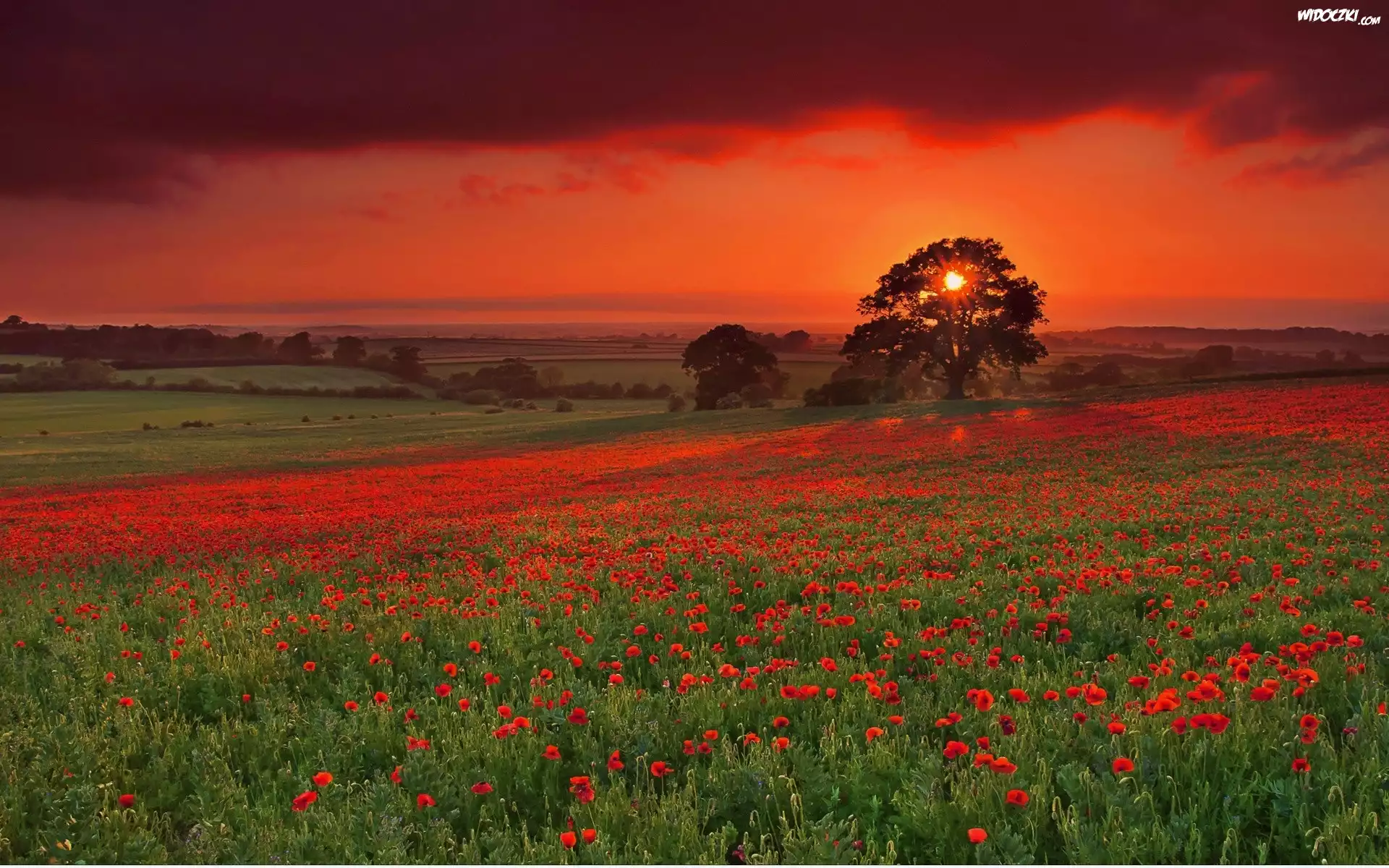 Zdjęcia, Łąka, Maki, Zachód, Słońca